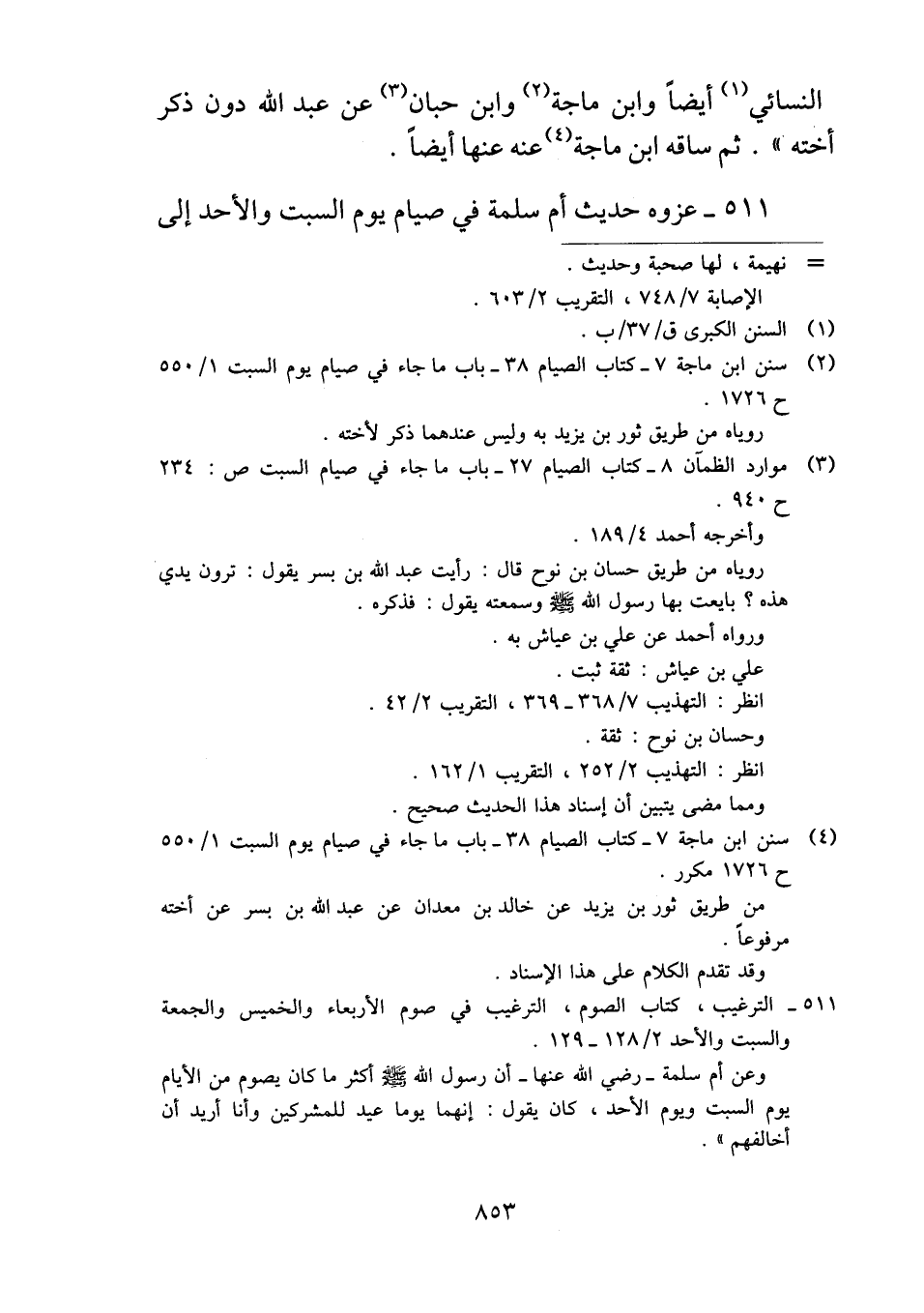 ٥١١ - عزوه حديث أم سلمة في صيام يوم السبت والأحد إلى
