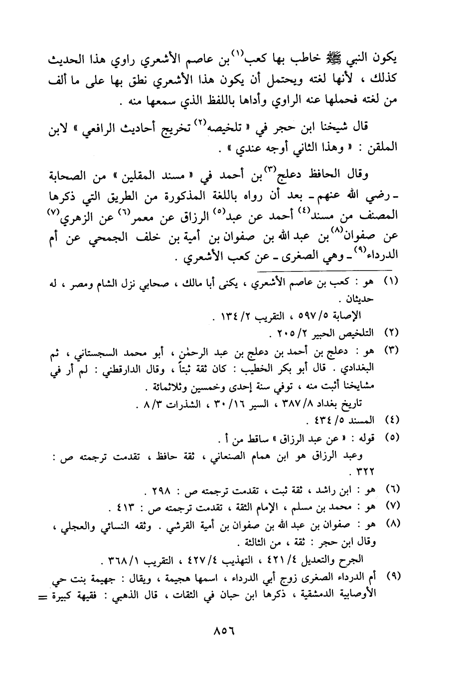 وقال الحافظ دعلج بن أحمد في "مسند المقلين" من الصحابة -رضي الله عنهم- بعد أن رواه باللغة المذكورة من الطريق التي ذكرها المصنف من مسند أحمد عن عبد الرزاق عن معمر عن الزهري عن صفوان بن عبد الله بن صفوان بن أمية بن خلف الجمحي عن أم الدرداء -وهي الصغرى- عن كعب الأشعري.