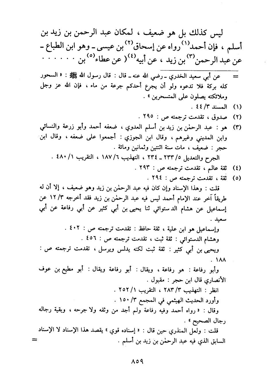 ليس كذلك بل هو ضعيف، لمكان عبد الرحمن بن زيد بن أسلم، فإن أحمد رواه عن إسحاق بن عيسى -وهو ابن الطباع- عن عبد الرحمن بن زيد، عن أبيه (عن عطاء بن
