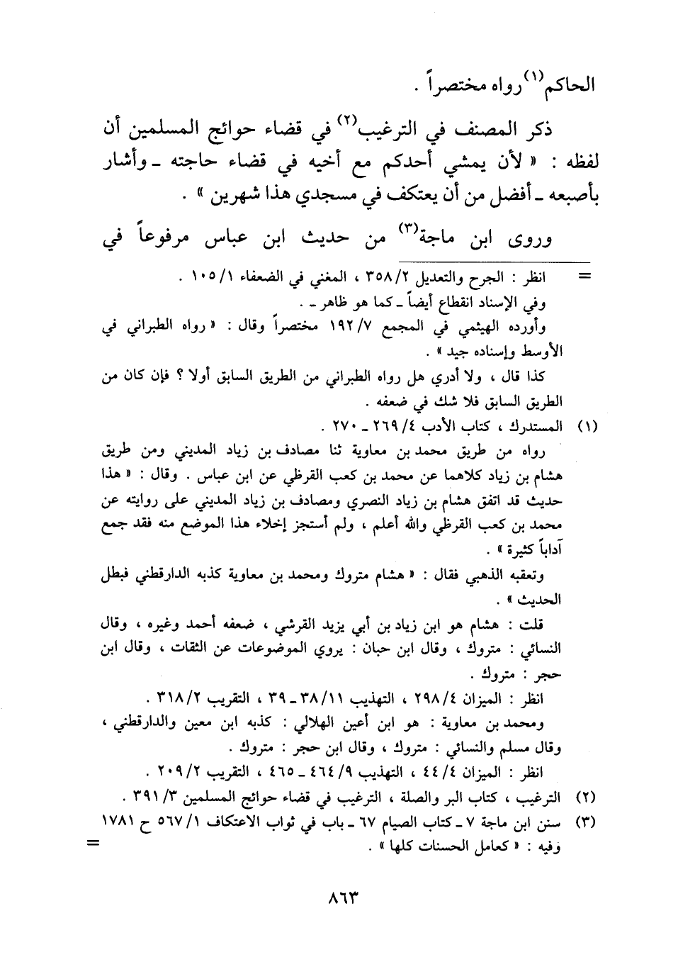ذكر المصنف في الترغيب في قضاء حوائج المسلمين أن لفظه: "لأن يمشي أحدكم مع أخيه في قضاء حاجته -وأشار بأصبعه- أفضل من أن يعتكف في مسجدي هذا شهرين".
