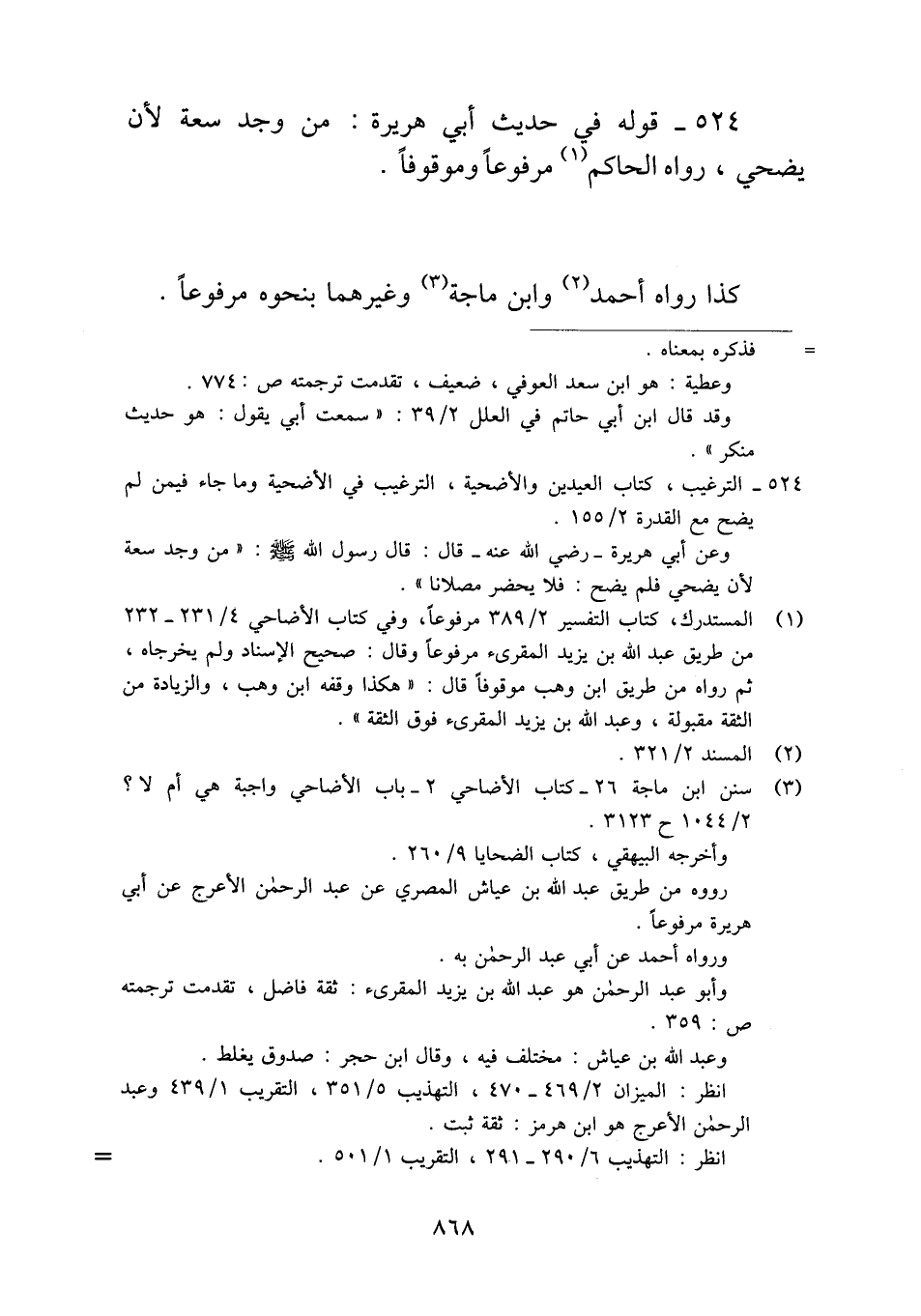 ٥٢٤ - قوله في حديث أبي هريرة: من وجد سعة لأن يضحي، رواه الحاكم مرفوعاً وموقوفاً.