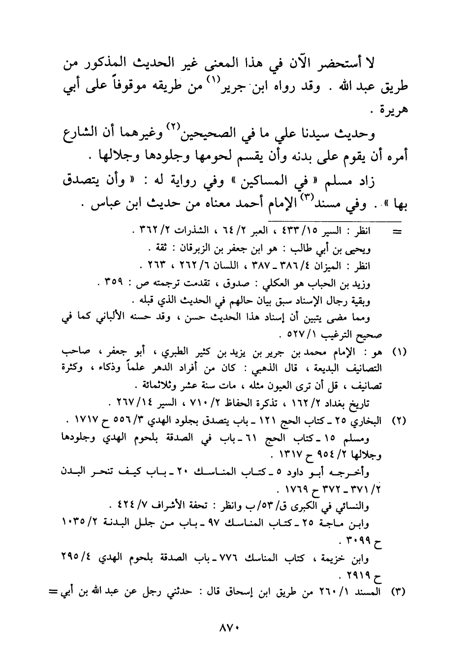 وحديث سيدنا علي ما في الصحيحين وغيرهما أن الشارع أمره أن يقوم على بدنه وأن يقسم لحومها وجلودها وجلالها.