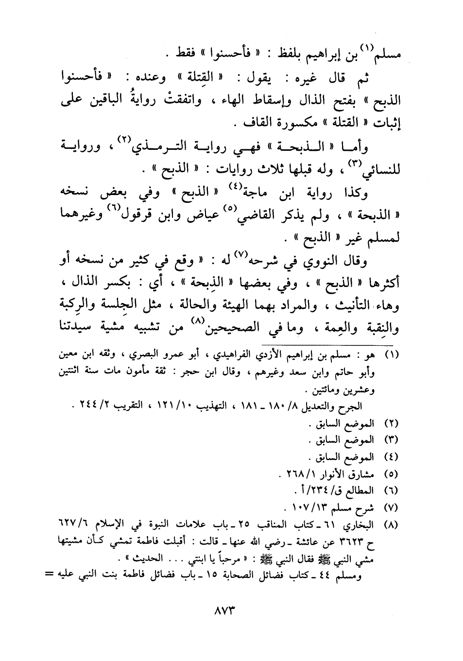 وقال النووي في شرحه له: "وقع في كثير من نسخه أو أكثرها "الذبح"، وفي بعضها " الذِبحة"، أي: بكسر الذال، وهاء التأنيث، والمراد بهما الهيئة والحالة، مثل الجِلسة والرِكبة والنِقبة والعِمة، وما في الصحيحين من تشبيه مشية سيدتنا