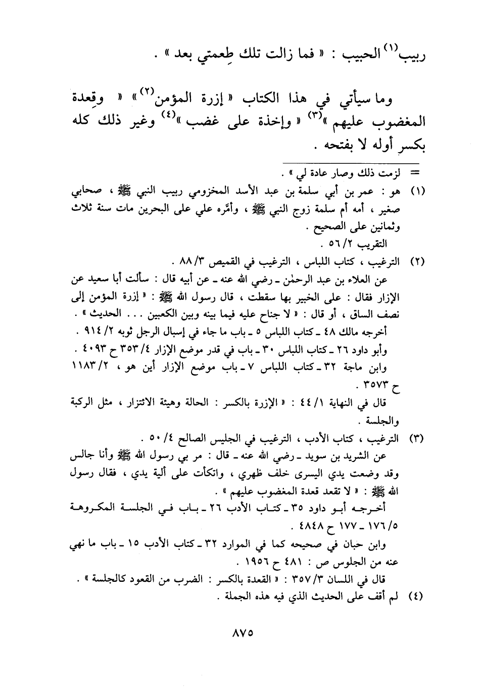 وما سيأتي في هذا الكتاب "إزرة المؤمن" "وقِعدة المغضوب عليهم" "وإخذة على غضب" وغير ذلك كله بكسر أوله لا بفتحه.