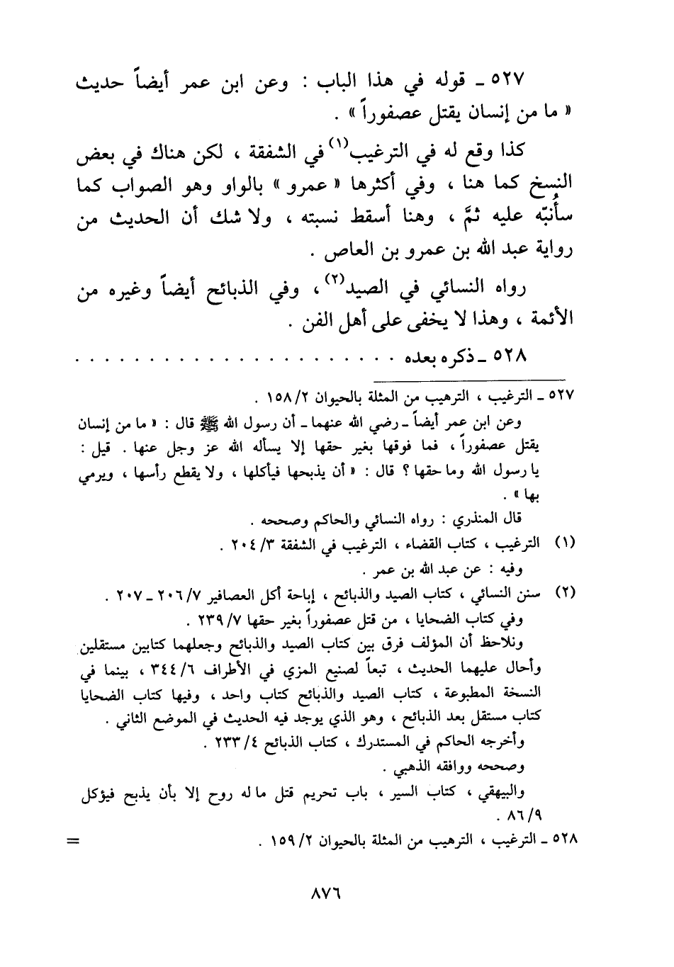 ٥٢٧ - قوله في هذا الباب: وعن ابن عمر أيضاً حديث "ما من إنسان يقتل عصفوراً".