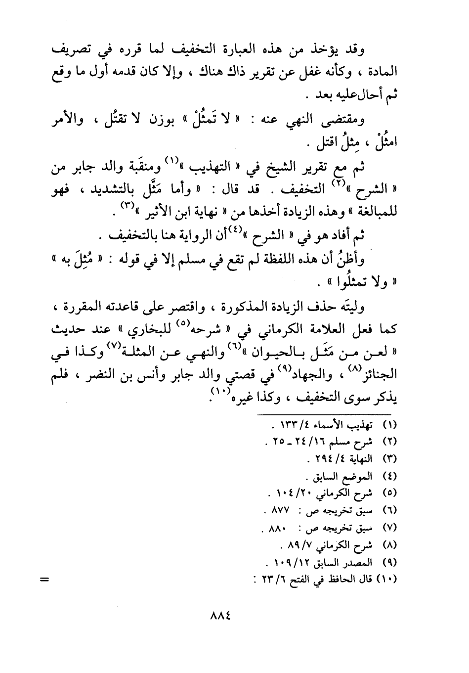 وليتَه حذف الزيادة المذكورة، واقتصر على قاعدته المقررة، كما فعل العلامة الكرماني في "شرحه للبخاري" عند حديث "لعن من مَثَل بالحيوان" والنهي عن المثلة وكذا في الجنائز، والجهاد في قصتي والد جابر وأنس بن النضر، فلم يذكر سوى التخفيف، وكذا غيره.