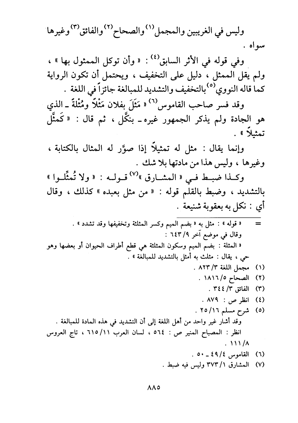 وفي قوله في الأثر السابق: "وأن توكل الممثول بها"، ولم يقل الممثل، دليل على التخفيف، ويحتمل أن تكون الرواية كما قاله النووي بالتخفيف والتشديد للمبالغة جائزاً في اللغة.