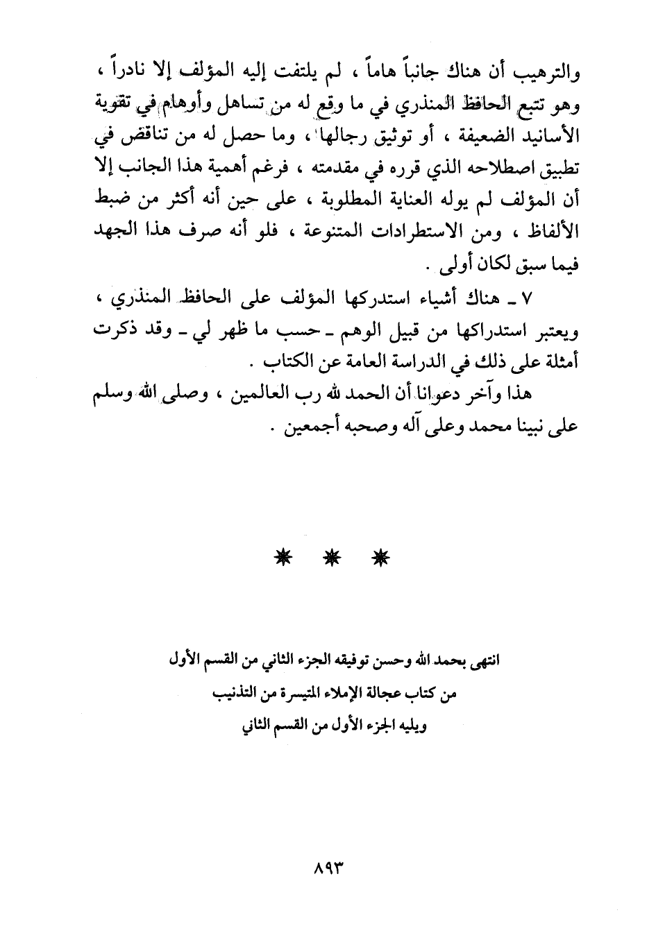 انتهى بحمد الله وحسن توفيقه الجزء الثاني من القسم الأول من كتاب عجالة الإملاء المتيسرة من التذنيب ويليه الجزء الأول من القسم الثاني