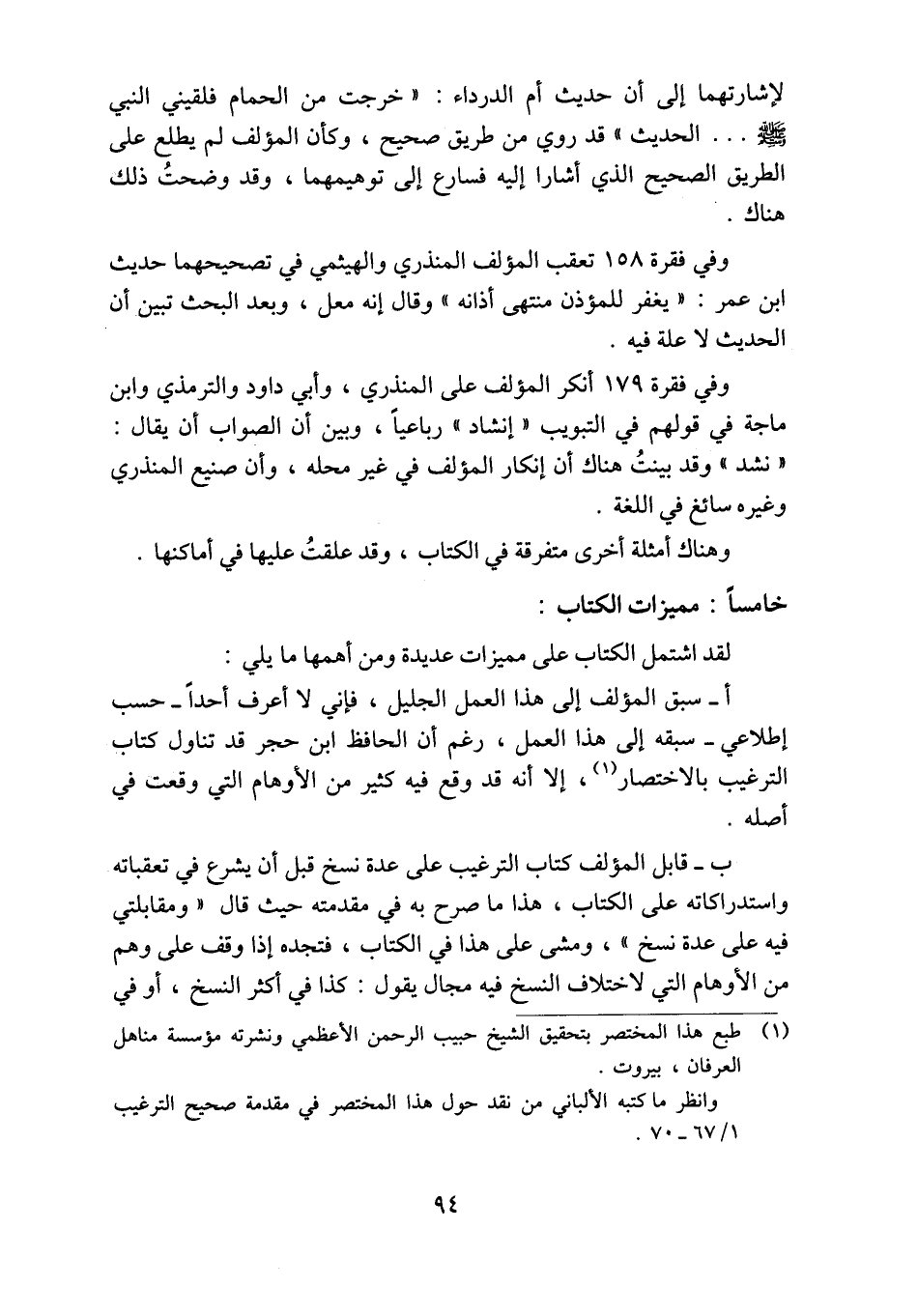 وانظر ما كتبه الألباني من نقد حول هذا المختصر في مقدمة صحيح الترغيب ١/ ٦٧ - ٧٠.