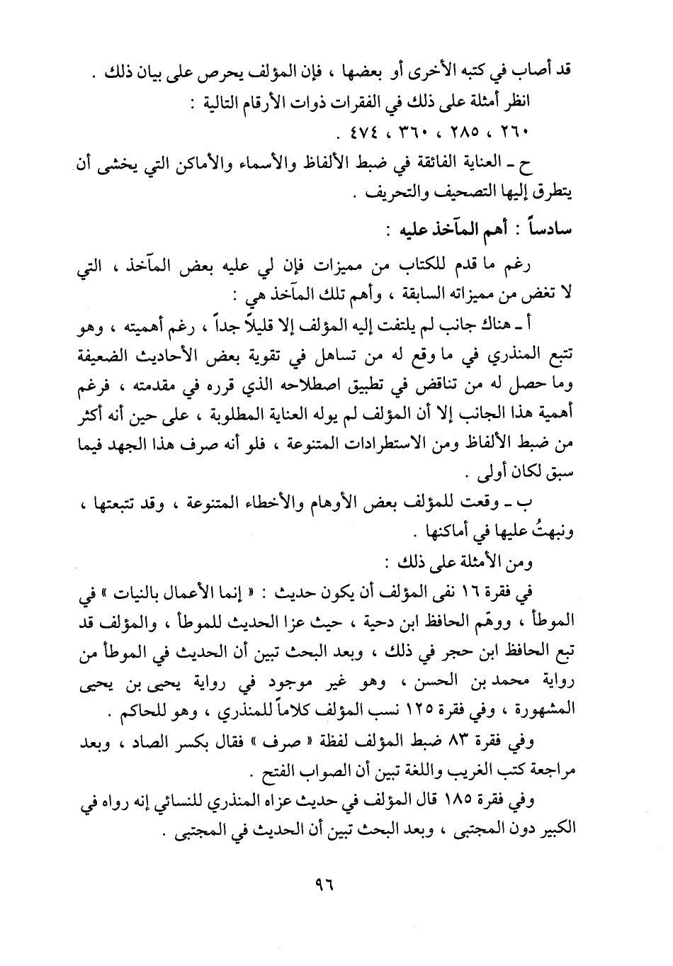 في فقرة ١٦ نفى المؤلف أن يكون حديث: "إنما الأعمال بالنيات" في الموطأ، ووهّم الحافظ ابن دحية، حيث عزا الحديث للموطأ، والمؤلف قد تبع الحافظ ابن حجر في ذلك، وبعد البحث تبين أن الحديث في الموطأ من رواية محمد بن الحسن، وهو غير موجود في رواية يحيى بن يحيى المشهورة، وفي فقرة ١٢٥ نسب المؤلف كلاماً للمنذري، وهو للحاكم.