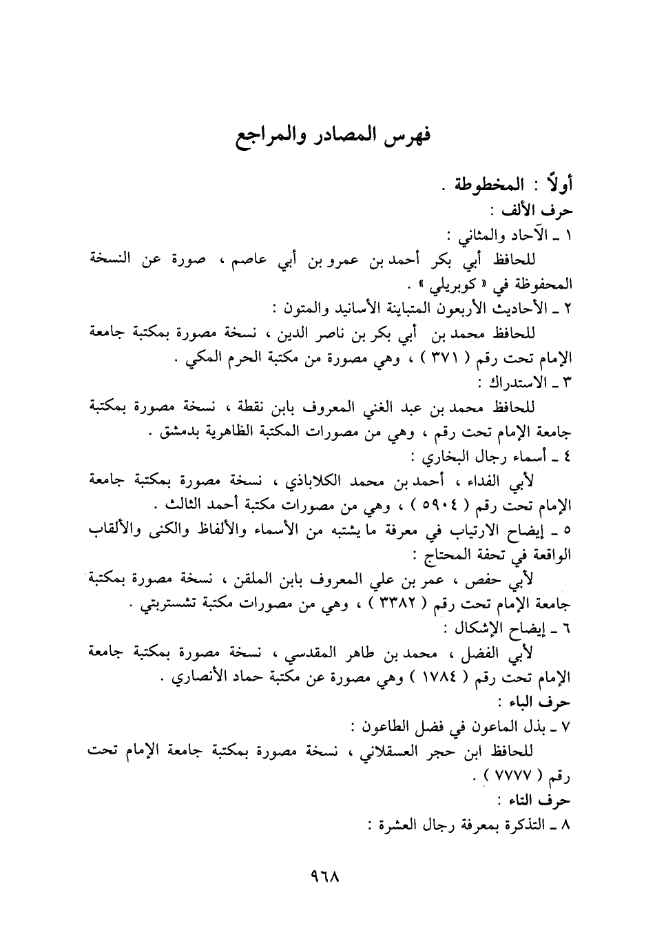 لأبي الفضل، محمد بن طاهر المقدسي، نسخة مصورة بمكتبة جامعة الإمام تحت رقم (١٧٨٤) وهي مصورة عن مكتبة حماد الأنصاري.