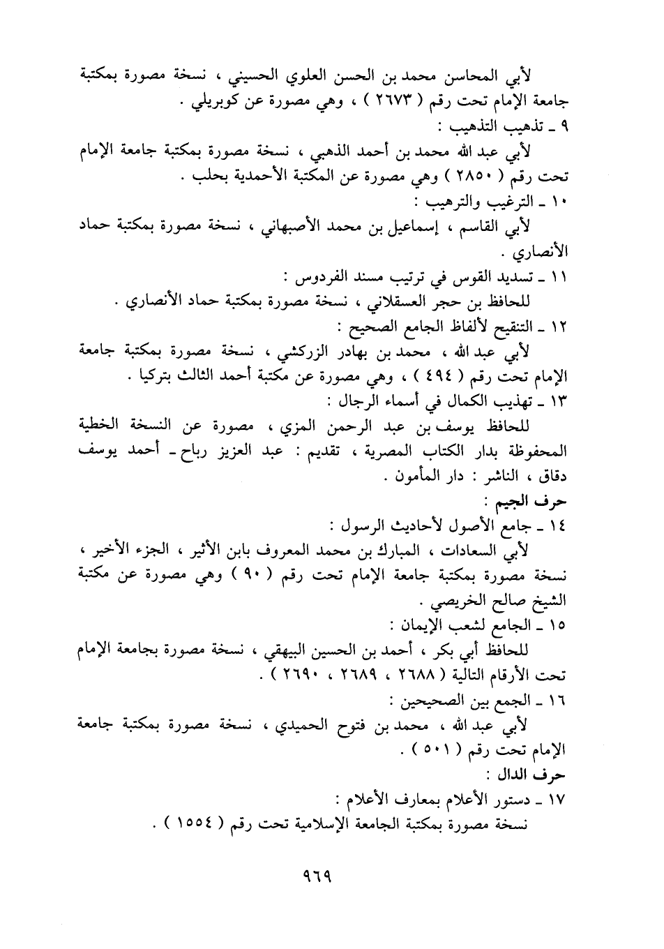 لأبي عبد الله محمد بن أحمد الذهبي، نسخة مصورة بمكتبة جامعة الإمام تحت رقم (٢٨٥٠) وهي مصورة عن المكتبة الأحمدية بحلب.