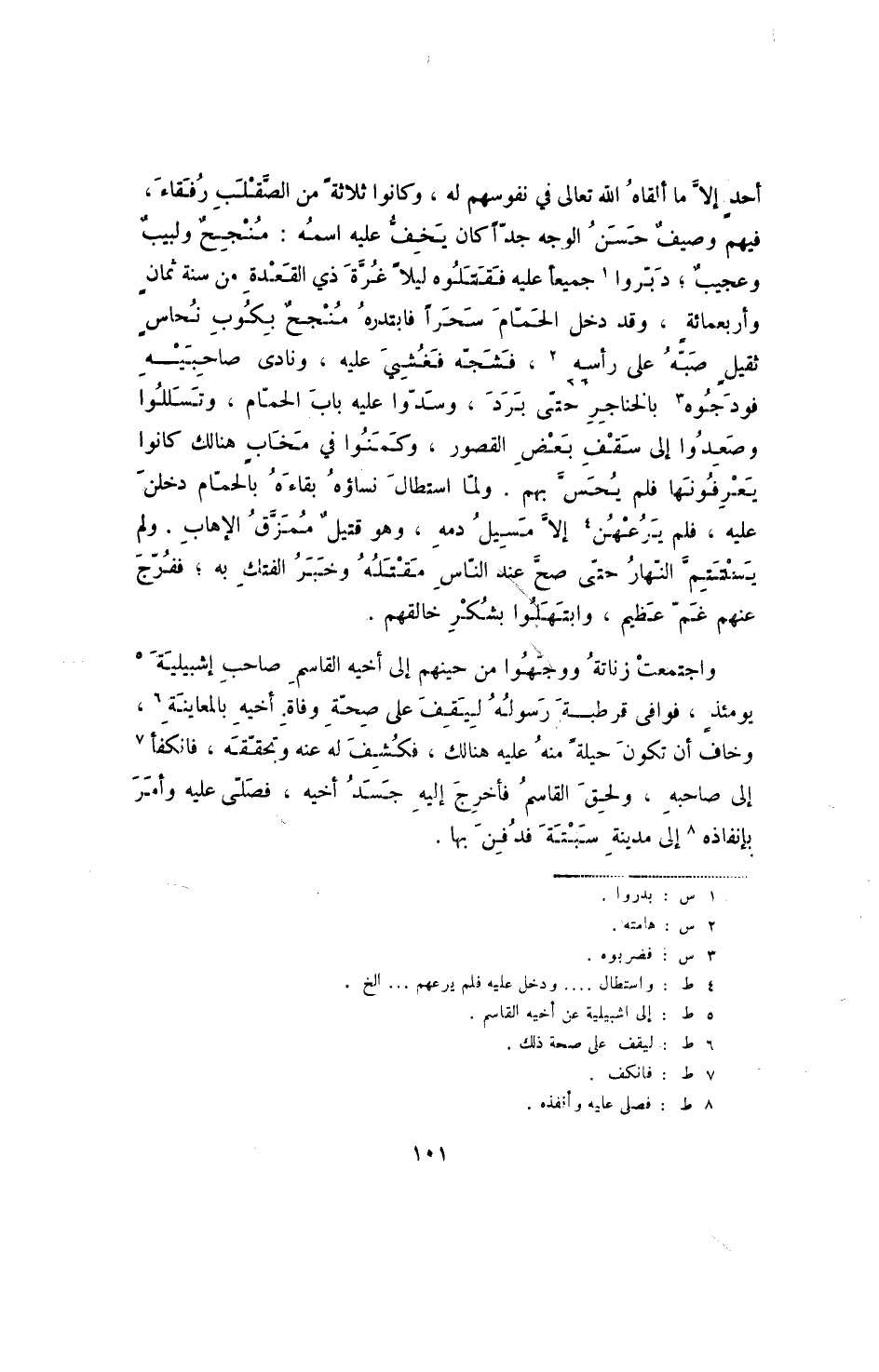 أحد إلا ما ألقاه الله تعالى في نفوسهم له، وكانوا ثلاثة من الصقلب رفقاء، فيهم وصيف حسن الوجه جدا كان يخف عليه اسمه: منجح ولبيب وعجيب؛ دبروا جميعا عليه فقتلوه ليلا غرة ذي القعدة من سنة ثمان وأربعمائة، وقد دخل الحمام سحرا فابتدره منجح بكوب نحاس ثقيل صبه على رأسه، فشجه فغشي عليه، ونادى صاحبيه فوجدوه بالخناجر حتى برد، وسدوا عليه باب الحمام، وتسللوا وصعدوا إلى سقف بعض القصور، وكمنوا في مخاب هنالك كانوا يعرفونها فلم يحس بهم. ولما استطال نساؤه بقاءه بالحمام دخلن عليه، فلم يرعهن إلا مسيل دمه، وهو قتيل ممزق الإهاب. ولم يستتم النهار حتى صح عند الناس مقتله وخبر الفتك به؛ ففرج عنهم غم عظيم، وابتهلوا بشكر خالقهم.