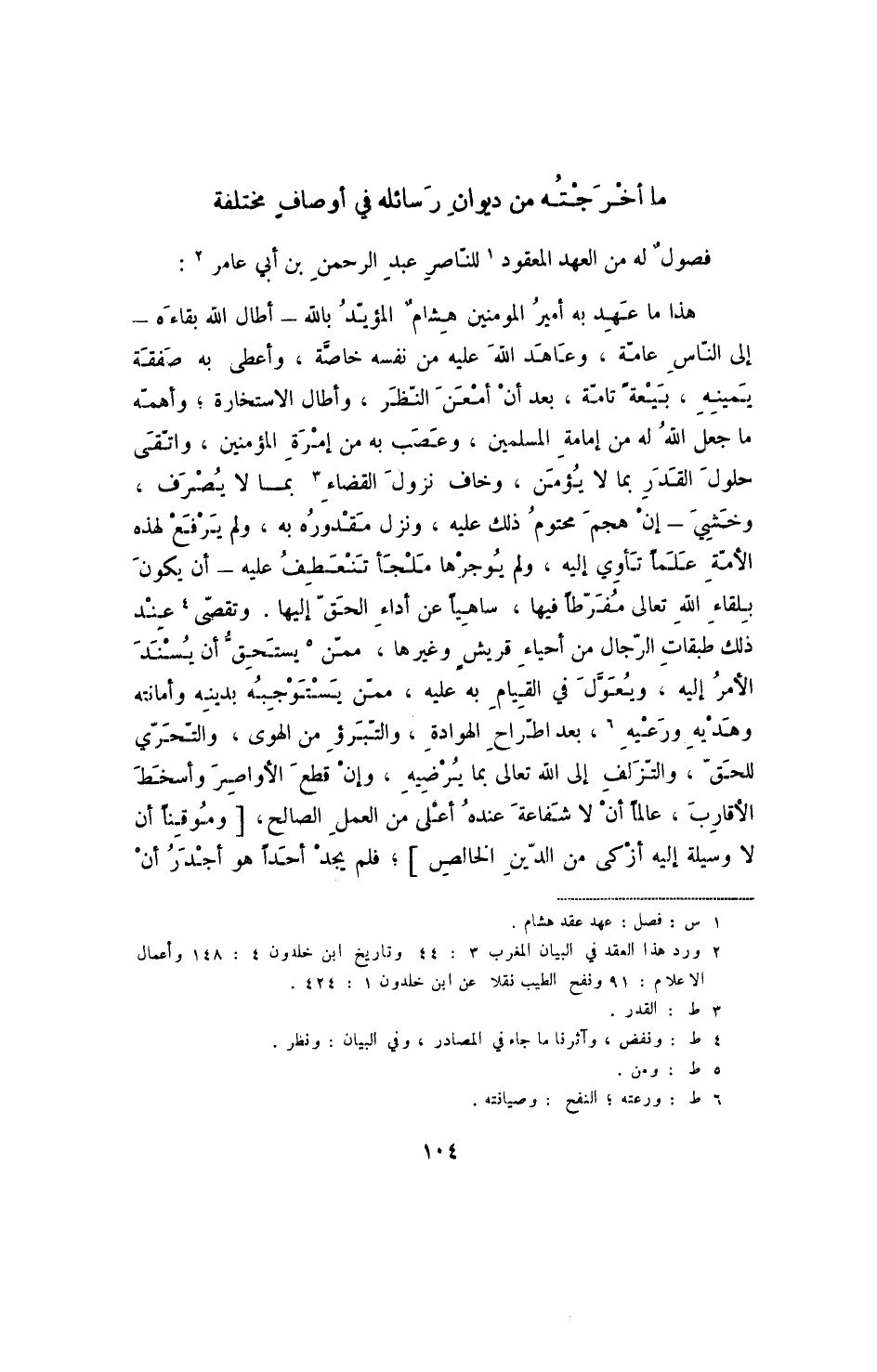 هذا ما عهد به أمير المؤمنين هشام المؤيد بالله - أطال الله بقاءه - إلى الناس عامة، وعاهد الله عليه من نفسه خاصة، وأعطى به صفقة يمينه، بيعة تامة، بعد أن أمعن النظر، وأطال الاستخارة؛ وأهمه ما جعل الله له من إمامة المسلمين، وعصب به إمرة المؤمنين، واتقى حلول القدر بما لا يؤمن، وخاف نزول القضاء بما لا يصرف، وخشي - إن هجم محتوم ذلك عليه، ونزل مقدوره به، ولم يرفع لهذه الأمة علما تأوي إليه، ولم يوجرها ملجأ تنعطف عليه - أن يكون بلقاء الله تعالى مفرطا إليه، ساهيا عن أداء الحق إليها. وتقصى عند ذلك طبقات الرجال من أحياء قريش وغيرها، ممن يستحق أن يسند الأمر إليه، ويعول في القيام به عليه، ممن يستوجبه بدينه وأمانته وهديه ورعيه، بعد اطراح الهوادة، والتبرؤ من الهوى، والتحري للحق، والتزلف إلى الله تعالى بما يرضيه، وإن قطع الأواصر وأسخط الأقارب، عالما أن لا شفاعة عنده أعلى من العمل الصالح، [وموقنا أن لا وسيلة إليه أزكى من الدين الخالص] ؛ فلم يجد أحدا هو أجدر أن
