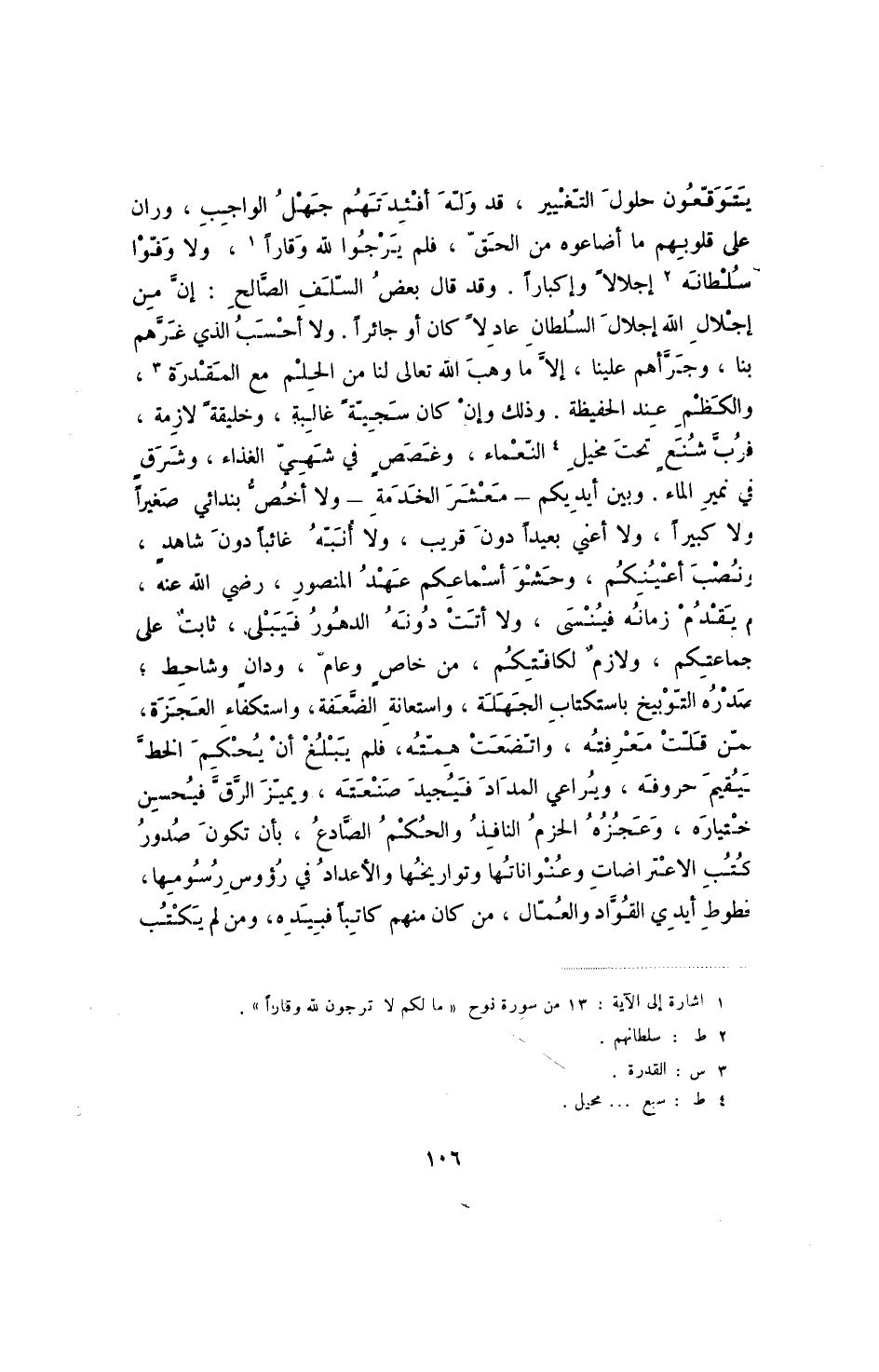 يتوقعون حلول التغيير، قد وله أفئدتهم جهل الواجب، وران على قلوبهم ما أضاعوه من الحق، فلم يرجوا لله وقارا، ولا وفوا سلطانه إجلالا وإكبارا. وقد قال بعض السلف الصالح: إن من إجلال الله إجلال السلطان عادلا كان أو جائرا. ولا أحسب الذي غرهم بنا، وجرأهم علينا، إلا ما وهب الله تعالى لنا من الحلم مع المقدرة، والكظم عند الحفيظة. وذلك وإن كان سجية غالبة، وخليقة لازمة، فرب شنع تحت مخيل النعماء، وغصص في شهي الغذاء، وشرق في نمير الماء. وبين أيديكم - معشر الخدمة - ولا أخص بندائي صغيرا ولا كبيرا، ولا أعني بعيدا دون قريب، ولا أنبه غائبا دون شاهد، ونصب أعينكم، وحشوا أسماعكم عهد المنصور، رضي الله عنه، لم يقدم زمانه فينسى، ولا أتت دونه الدهور فيبلى، ثابت على جماعتكم، ولازم لكافتكم، من خاص وعا، ودان وشاحط، صدره التوبيخ باستكتاب الجهلة، واستعانة الضعفة، واستكفاء العجزة، ممن قلت معرفته، واتضعت همته، فلم يبلغ أن يحكم الخط فيقيم حروفه، ويراعي المداد فيجيد صنعته، ويميز الرق فيحسن اختياره، وعجزه الحزم النافذ والحكم الصادع، بأن تكون صدور كتب الاعتراضات وعنواناتها وتواريخها والأعداد في رؤوس رسومها، بخطوط أيدي القواد والعمال، من كان منهم كاتبا فبيده، ومن لم يكتب