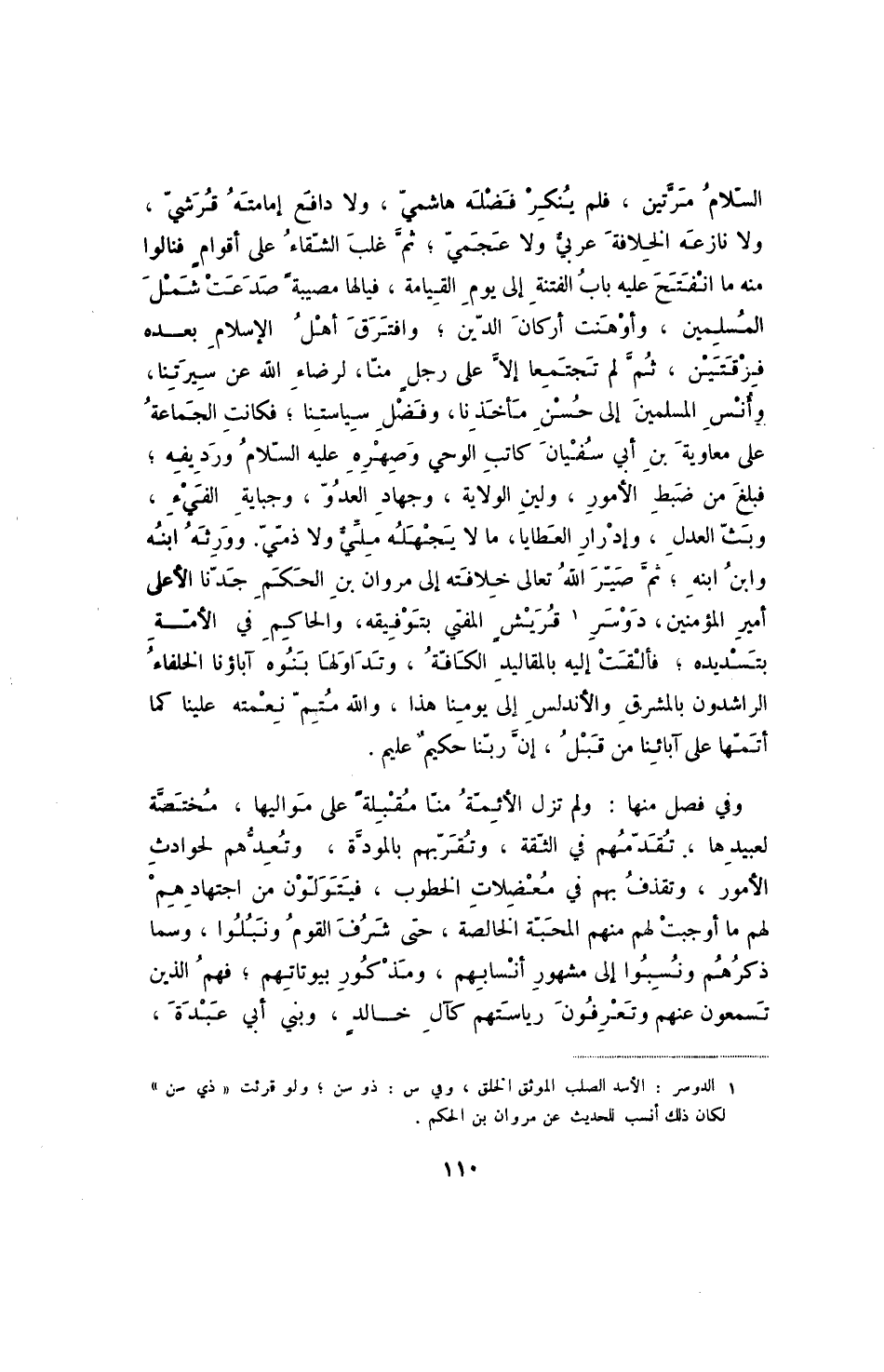 السلام مرتين، فلم ينكر فضله هاشمي، ولا دافع إمامته قرشي، ولا نازعه الخلافة عربي ولا عجمي؛ ثم غلب الشقاء على أقوام فنالوا منه ما انفتح عليه باب الفتنة، إلى يوم القيامة، فيالها مصيبة صدعت شمل المسلمين، وأوهنت أركان الدين؛ وافترق أهل الإسلام بعده فرقتين، ثم لم تجتمعا إلا على رجل منا، لرضاء الله عن سيرتنا، وأنس المسلمين إلى حسن مأخذنا، وفضل سياستنا؛ فكانت الجماعة على معاوية بن أبي سفيان كاتب الوحي وصهره عليه السلام ورديفه؛ فبلغ من ضبط الأمور، ولين الولاية، وجهاد العدو، وجباية الفيء، وبث العدل، وإدرار العطايا، ما لا يجهله ملي ولا ذمي. وورثه ابنه وابن ابنه؛ ثم صير الله تعالى خلافته إلى مروان بن الحكم جدنا الأعلى أمير المؤمنين، دوسر قريش المفتي بتوفيقه، والحاكم في الأمة بتسديده؛ فألقت إليه بالمقاليد الكافة، وتداولها بنوه آباؤنا الخلفاء الراشدون بالمشرق والأندلس إلى يومنا هذا، والله متم نعمته علينا كما أتمها على آبائنا من قبل، إن ربنا حكيم عليم.