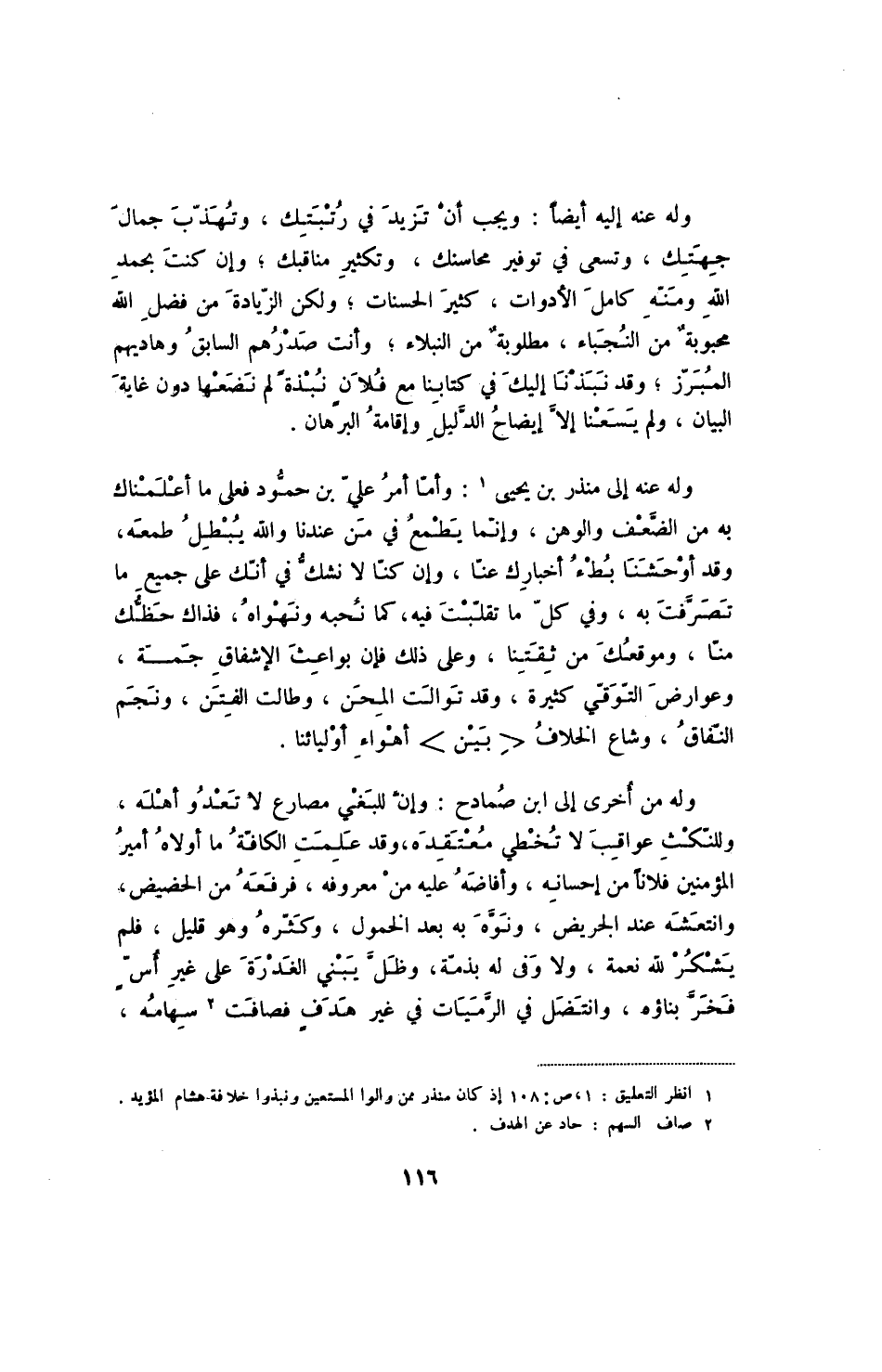 وله عنه إلى منذر بن يحيى: وأما أمر عليّ بن حمود فعلى ما أعلمناك به من الضعف والوهن، وإنما يطمع في من عندنا والله يبطل طمعه، وقد أوحشنا بطء أخبارك عنا، وإن كنا لا نشك في أنك على جميع ما تصرفت به، وفي كل ما تقلبت فيه، كما نحبه ونهواه، فذاك حظك منا، وموقعك من ثقتنا، وعلى ذلك فإن بواعث الإشفاق جمة، وعوارض التوقي كثيرة، وقد توالت المحن، وطالت الفتن، ونجم النفاق، وشاع الخلاف أهواء أوليائنا.
