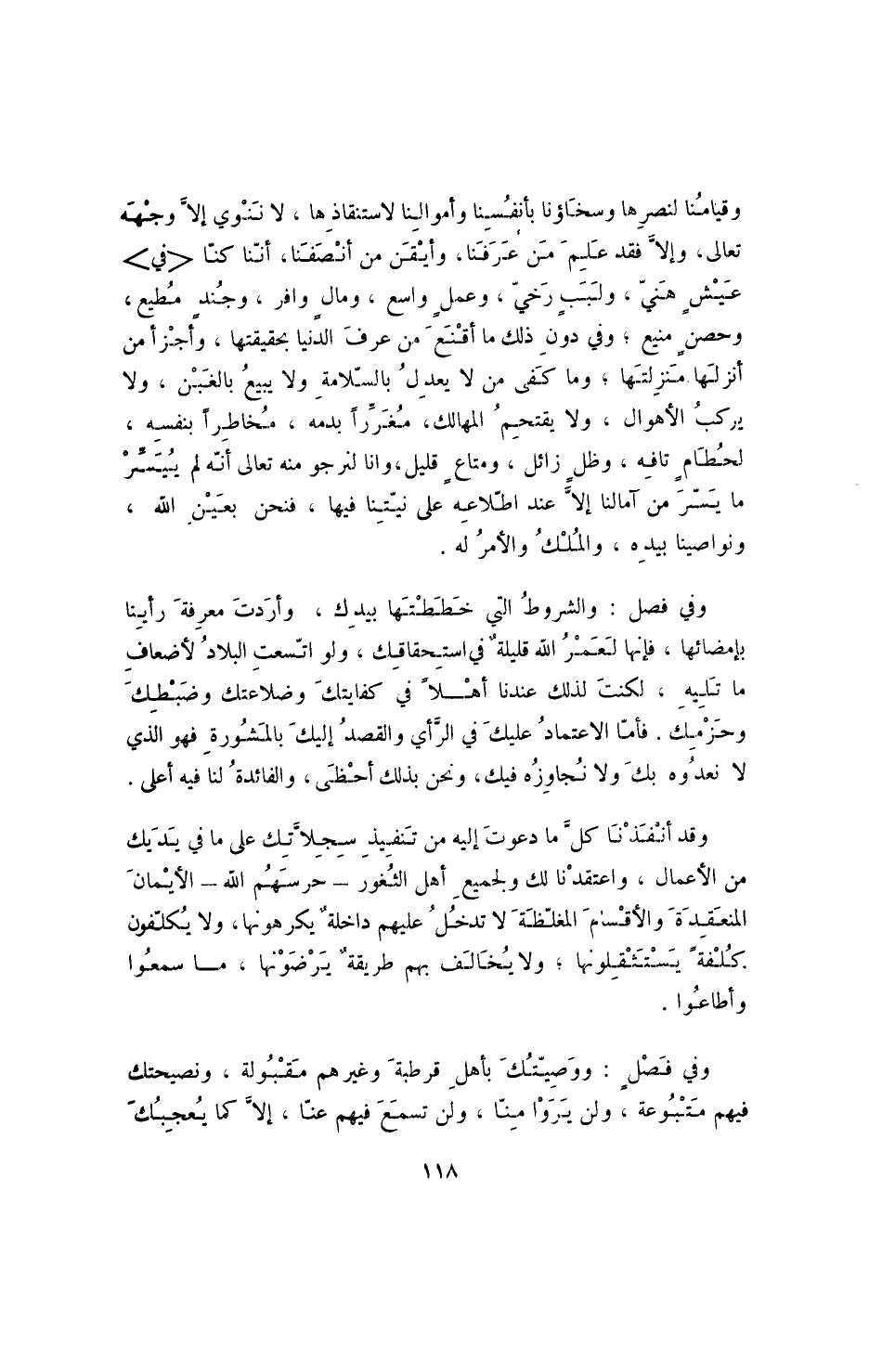 وفي فصل: والشروط التي خططتها بيدك، وأردت معرفة رأينا بإمضائها، فإنها لعمر الله قليلة في استحقاقك، ولو اتسعت البلاد لأضعاف ما تليه، لكنت لذلك عندنا أهلا في كفايتك وضلاعتك وضبطك وحزمك. فأما الاعتماد عليك في الرأي والقصد إليك بالمشورة فهو الذي لا نعدوه بك ولا نجاوزه فيك، ونحن بذلك أحظى، والفائدة لنا فيه أعلى.