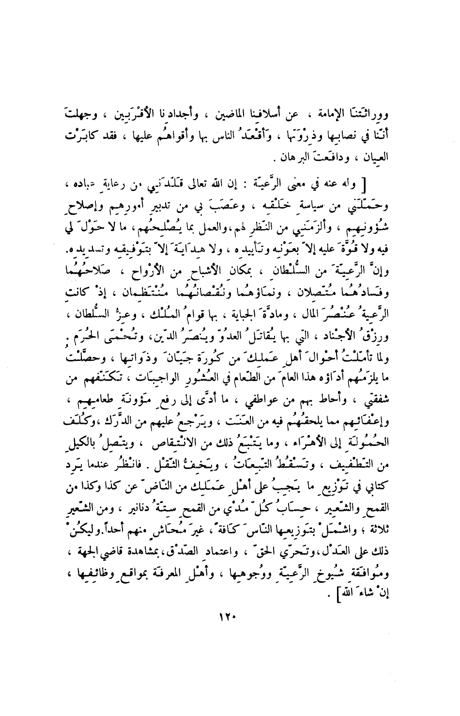 [وله عنه في معنى الرعية: إن الله تعالى قلدني من رعاية عباده، وحملني من سياسة خلقه، وعصب بي من تدبير أمورهم وإصلاح شؤونهم، وألزمني من النظر لهم، والعمل بما يصلحهم، ما لا حول لي فيه ولا قوة عليه إلا بمعونه وتأييده، ولا هداية إلا بتوفيقه وتسديده. وإن الرعية من السلطان، بمكان الأشباح من الأرواح، صلاحهما وفسادهما متصلان، ونماؤهما ونقصانهما منتظمان، إذ كانت الرعية عنصر المال، ومادة الجباية، بها قوام الملك، وعز السلطان، ورزق الأجناد، التي بها يقاتل العدو وينصر الدين، وتحمى الحرم، ولما تأملت أحوال أهل عملك من كورة جيان وذواتها، وحصلت ما يلزمهم أداؤه هذا العام من الطعام في العشور الواجبات، تكنفهم من شفقتي، وأحاط بهم من عواطفي، ما أدى إلى رفع مؤونة طعامهم، وإعفائهم مما يلحقهم فيه من العنت، ويرجع عليهم من الدرك، وكلف الحمولة إلى الأهراء، وما يتبع ذلك من الانتقاص ويتصل بالكيل من التطفيف، وتسقط التبعات، ويخف الثقل،. فانظر عندما يرد كتابي في توزيع ما يجب على أهل عملك من الناض عن كذا وكذا من القمح والشعير، حساب كل مدي من القمح ستة دنانير، ومن الشعير ثلاثة؛ واشمل بتوزيعها الناس كافة، غير محاش منهم أحدا. وليكن ذلك على العدل، وتحري الحق، واعتماد الصدق، بمشاهدة قاضي الجهة، وموافقة شيوخ الرعية ووجوهها، وأهل المعرفة بمواقع وظائفها، إن شاء الله] .