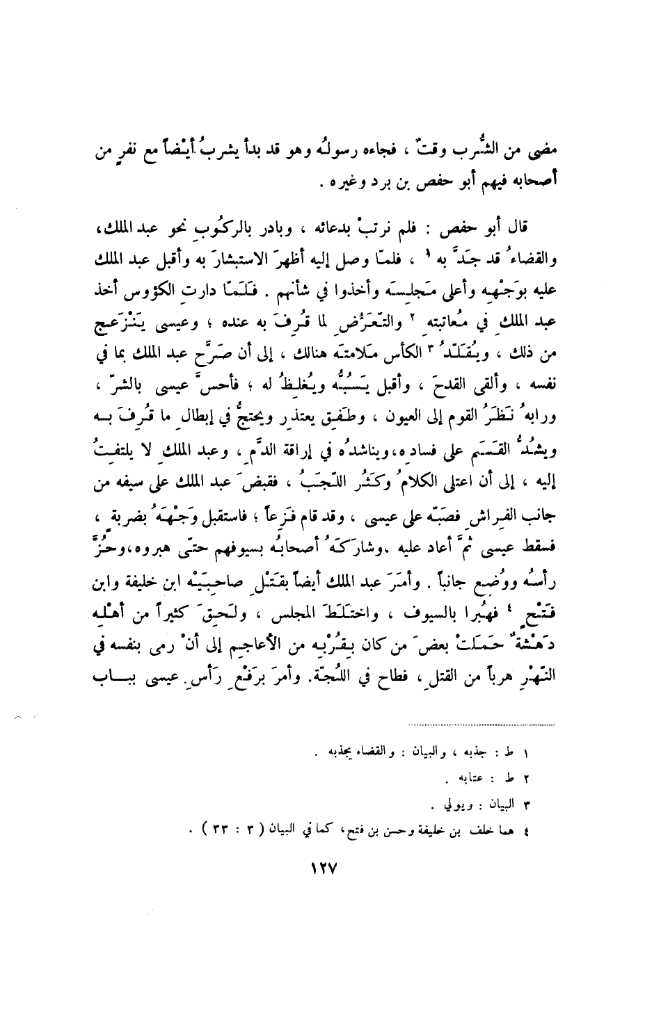 قال أبو حفص: فلم نرتب بدعائه، وبادر بالركوب نحو عبد الملك، والقضاء قد جد به، فلما وصل إليه أظهر الاستبشار به وأقبل عبد الملك عليه بوجهه وأعلى مجلسه وأخذوا في شأنهم. فلما دارت الكؤوس أخذ عبد الملك في معاتبته والتعرض لما قرف به عنده؛ وعيسى ينزعج من ذلك، ويقلد الكأس ملامته هنالك، إلى أن صرح عبد الملك بما في نفسه، وألقى القدح، وأقبل يسبه ويغلظ له؛ فأحس عيسى بالشر، ورابه نظر القوم إلى العيون، وطفق يعتذر ويحتج في إبطال ما قرف به ويشد القسم على فساده، ويناشده في إراقة الدم، وعبد الملك لا يلتفت إليه، إلى أن اعتلى الكلام وكثر اللجب، فقبض عبد الملك على سيفه من جانب الفراش فصبه على عيسى، وقد قام فزعاً؛ فاستقبل وجهه بضربة، فسقط عيسى ثم أعاد عليه، وشاركه أصحابه بسيوفهم حتى هبروه، وحز رأسه ووضع جانباً. وأمر عبد الملك أيضاً بقتل صاحبيه ابن خليفة وابن فتح فهبرا بالسيوف، واختلط المجلس، ولحق كثيراً من أهله دهشة حملت بعض من كان بقربه من الأعاجم إلى أن رمى بنفسه في النهر هرباً من القتل، فطاح في اللجنة. وأمر برفع رأس عيسى بباب