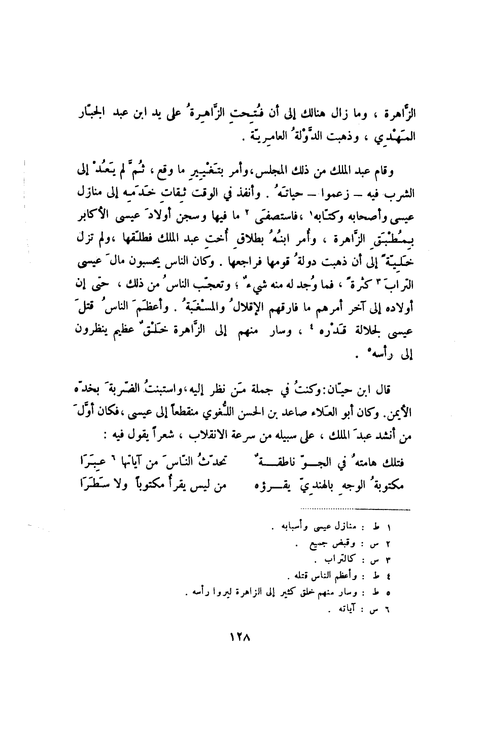 قال ابن حيان: وكنت في جملة من نظر إليه، واستبنت الضربة بخده الأيمن. وكان أبو العلاء صاعد بن الحسن اللغوي منقطعاً إلى عيسى، فكان أول من أنشد عبد الملك، على سبيله من سرعة الانقلاب، شعراً يقول فيه: