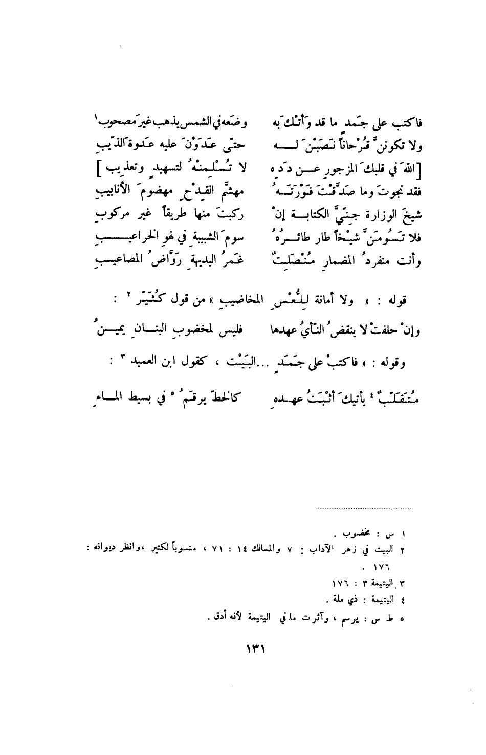 وأنت منفرد المضمار منصلت ... غمر البديهة رواض المصاعيب قوله: " ولا أمانة للعس المخاضيب " من قول كثير:
