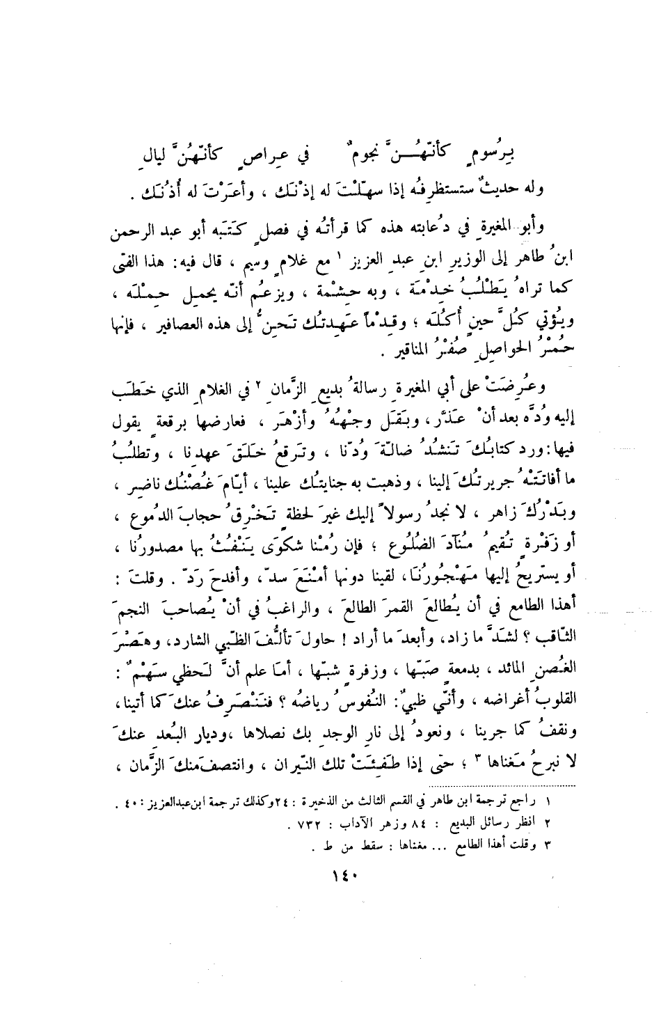 وعرضت على أبي المغيرة رسالة بديع الزمان في الغلام الذي خطب إليه وده بعد أن عذر، وبقل وجهه وأزهر، فعارضها برقعةٍ يقول فيها: ورد كتابك تنشد ضالة ودنا، وترقع خلق عهدنا، وتطلب ما أفاتته جريرتك إلينا، وذهبت به جنايتك علينا، أيام غصنك ناضر، وبدرك زاهر، لا نجد رسولاً إليك غير لحظة تخرق حجاب الدموع، أو زفرة تقيم منآد الضلوع؛ فإن رمنا شكوى ينفث بها مصدورنا، أو يستريح إليها مهجورنا، لقينا دونها أمنع سد، وأفدح رد. وقلت: أهذا الطامع في أن يطالع القمر الطالع، والراغب في أن يصاحب النجم الثاقب - لشد ما زاد، وأبعد ما أراد! حاول تألف الظبي الشارد، وهصر الغصن المائد، بدمعة صبها، وزفرة شبها، أما علم أن لحظي سهم: القلوب أغراضه، وأني ظبي: النفوس رياضه - فننصرف عنك كما أتينا، ونقف كما جرينا، ونعود إلى نار الوجد بك نصلاها، ونار البعد عنك لا نبرح مغناها؛ حتى إذا طفئت تلك النيران، وانتصف منك الزمان