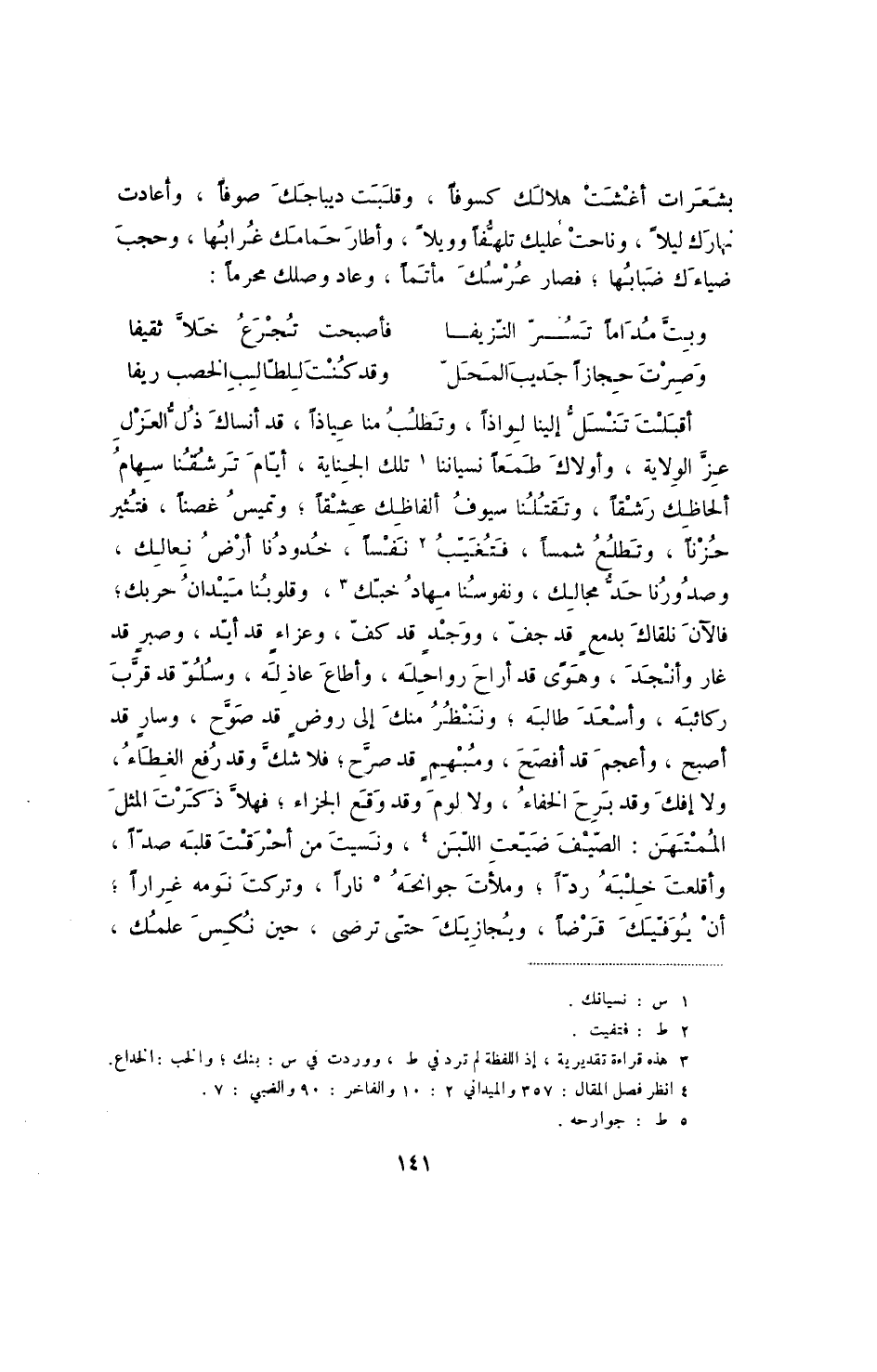 وصرت حجازاً جديب المحل ... وقد كنت للطالب الخصب ريفا أقبلت تنسل إلينا لواذاً، وتطلب منا عياذاً، قد أنساك ذل العزل عز الولاية، وأولاك طمعاً نسيانناً تلك الجناية، أيام ترشقنا سهام ألحاظك رشقاً، وتقتلنا سيوف ألفاظك عشقاً؛ وتميس غصناً، فتثير حزناً، وتطلع شمساً، فتغيب نفساً، خدودنا أرض نعالك، وصدورنا حد مجالك، ونفوسنا مهاد خبك، وقلوبنا ميدان حربك؛ فالآن نلقاك بدمعٍ قد جف، ووجد قد كف، وعزاء قد أيد، وصبر قد غار وأنجد، وهوىً قد أراح رواحله، وأطاع عاذله، وسلو قد قرب ركائبه، واسعد طالبه؛ وننظر منك إلى روضٍ قد صوح، وسار قد أصبح، وأعجم قد أفصح، ومبهم قد صرح؛ فلا شك وقد رفع الغطاء، ولا إفك وقد برح الخفاء، ولا لوم وقد وقع الجزاء؛ فهلا ذكرت المثل الممتهن: الصيف ضيعت اللبن، ونسيت من أحرقت قلبه صداً، وأقلعت خلبه رداً؛ وملأت حوانحه ناراً، وتركت نومه غراراً؛ أن يوفيك قرضاً، ويجازيك حتى ترضى، حين نكس علمك