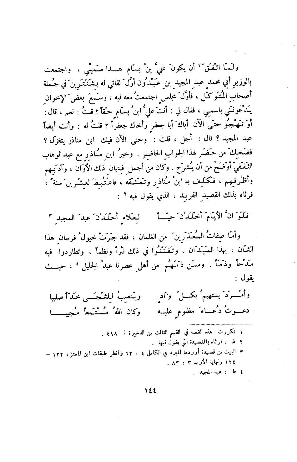 ولما اتفق أن يكون علي بن بسام هذا سمي، واجتمعت بالوزير أبي محمد عبد المجيد بن عبدون أول لقائي له بشنترين في جملة أصحاب المتوكل، فأول مجلس اجتمعت معه فيه، وسمع بعض الإخوان يدعونني باسمي، فقال لي: أنت علي ابن بسام حقاً - قلت: نعم، قال: أو تهجو حتى الآن أباك أبا جعفر وأخاك جعفراً - قلت له: وأنت أيضاً عبد المجيد - قال: أجل، قلت: وحتى الآن فيك ابن مناذر يتغزل - فضحك من حضر لهذا الجواب الحاضر. وخبر ابن مناذر مع عبد الوهاب الثقفي أوضح من أن يشرح. وكان من أجمل فتيان ذلك الأوان، وآدبهم وأظرفهم، فكلف به ابن مناذر وتعشقه، فاعتبط لعشرين سنة، فرثاه بذلك القصيد الفريد، الذي يقول فيه: