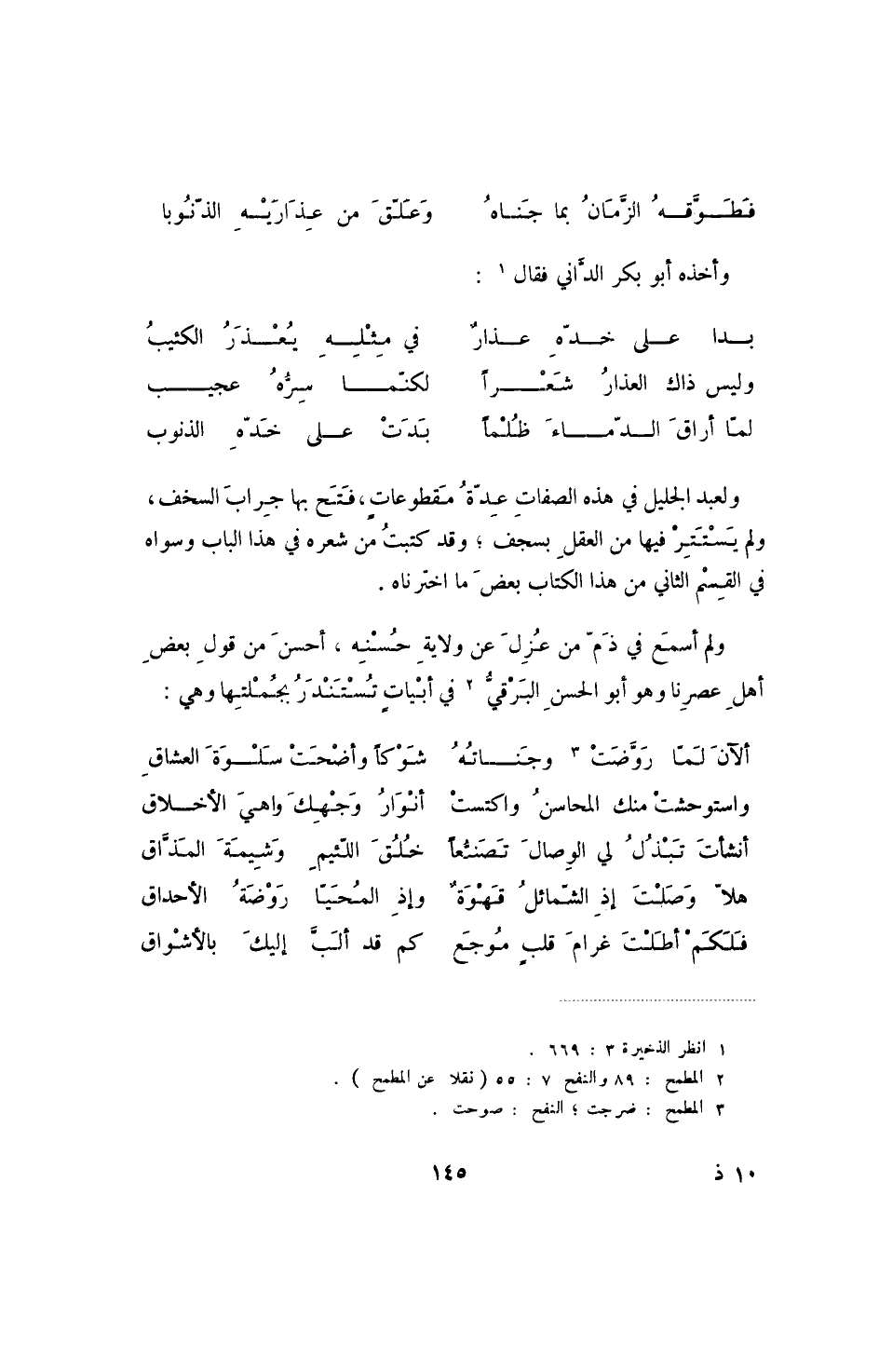 فطوقه الزمان بما جناه ... وعلق من عذاريه الذنوبا وأخذه أبو بكر الداني فقال: