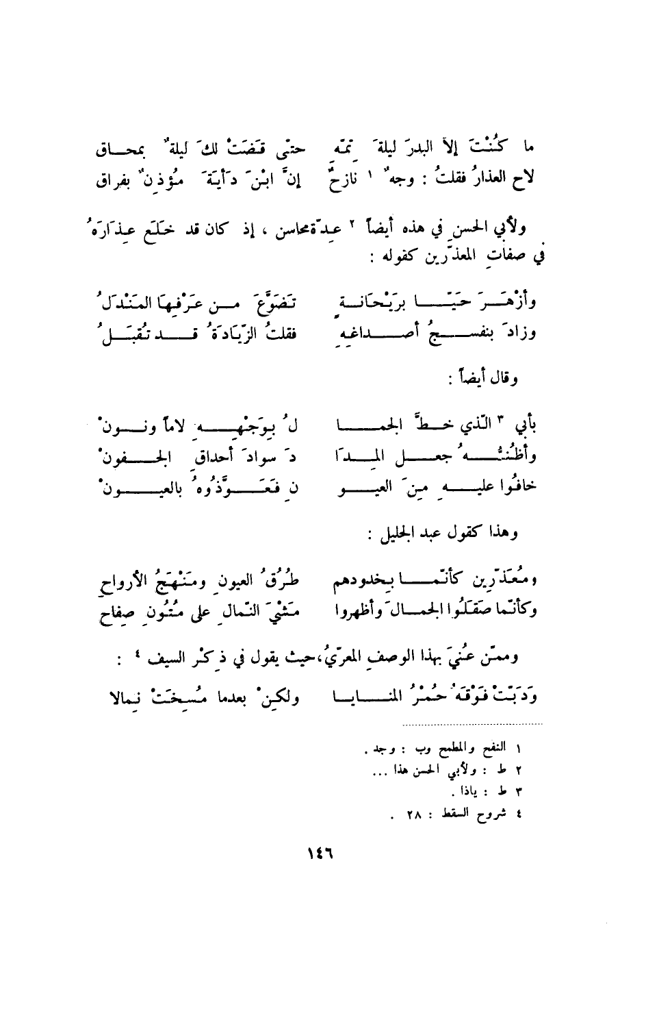لاح العذار فقلت: وجه نازح ... حتى قضت لك ليلة بمحاق ولأبي الحسن في هذه أيضاً عدة محاسن، إذ كان قد خلع عذاره في صفات المعذرين كقوله: