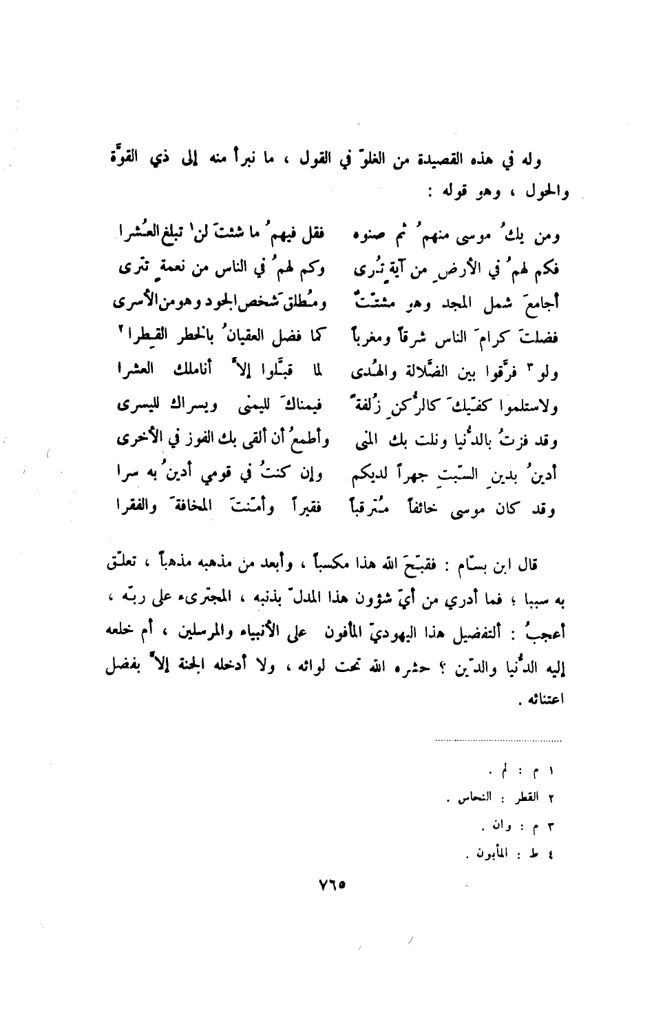وقد كان موسى خائفاً مترقباً ... فقيراً وأمنت المخافة والفقرا قال ابن بسام: فقبح الله هذا مكسباً، وأبعد من مذهبه مذهباً، تعلق به سببا؛ فما أدري من أي شؤون هذا المدل بذنبه، المجترئ على ربه، أعجب: ألتفضيل هذا اليهودي المأفون، على الأنبياء والمرسلين، أم خلعه إليه الدنيا والدين - حشره الله تحت لوائه، ولا أدخله الجنة إلا بفضل اعتنائه.