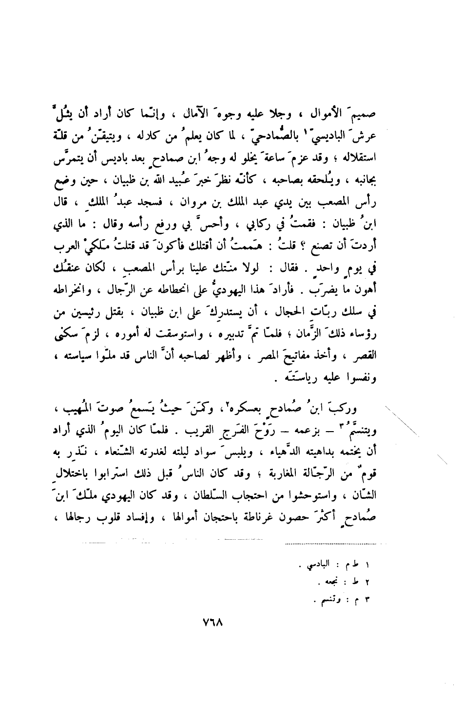 صميم الأموال، وجلا عليه وجوه الآمال، وإنما كان أراد أن يثل عرش الباديسي بالصمادحي، لما كان يعلم من كلاله، ويتيقن من قلة استقلاله؛ وقد عزم ساعة يخلو له وجه ابن صمادح بعد باديس أن يتمرس بجانبه، ويلحقه بصاحبه، كأنه نظر خبر عبيد الله بن ظبيان، حين وضع رأس المصعب بين يدي عبد الملك بن مروان، فسجد عبد الملك، قال ابن ظبيان: فقمت في ركابي، وأحس بي ورفع رأسه وقال: ما الذي أردت أن تصنع - قلت: هممت أن أقتلك فأكون قد قتلت ملكي العرب في يوم واحد. فقال: لولا منتك علينا برأ المصعب، لكان عنقك أهون ما يضرب. فأراد هذا اليهودي على انحطاطه عن الرجال، وانخراطه في سلك ربات الحجال، أن يستدرك على ابن ظبيان، بقتل رئيسين من رؤساء ذلك الزمان؛ فلما تم تدبيره، واستوسقت له أموره، لزم سكنى القصر، وأخذ مفاتيح المصر، وأظهر لصاحبه أن الناس قد ملوا سياسته، ونفسوا عليه رياسته.