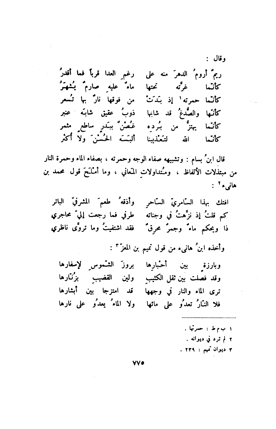 كأنما الله لتعذيبنا ... ألبسه الحسن ولا أكثر قال ابن بسام: وتشبيهه صفاء الوجه وحمرته، بصفاء الماء وحمرة النار من مبتذلات الألفاظ، ومتداولات المعاني، وما أملح قول محمد بن هانئ: