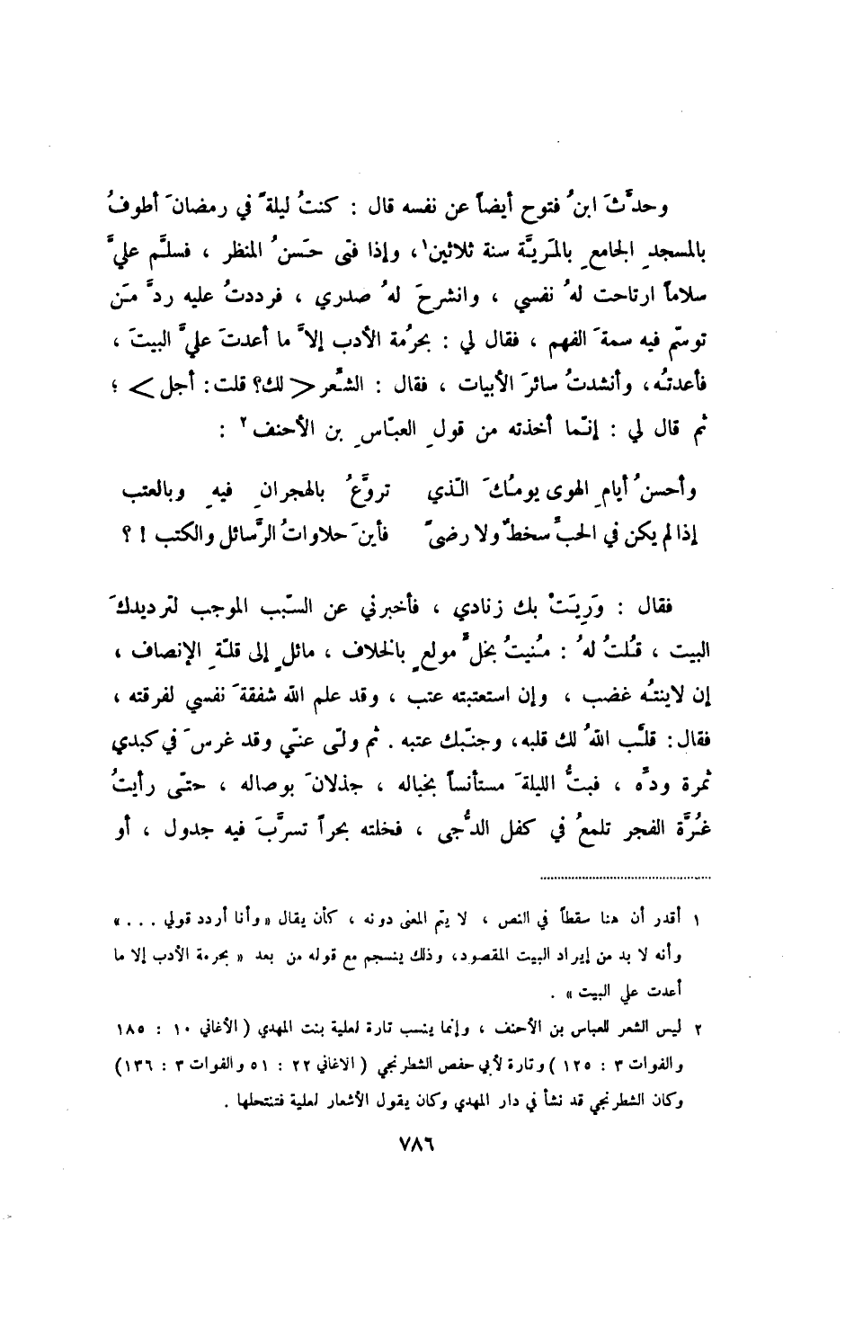 وحدث ابن فتوح أيضاً عن نفسه قال: كنت ليلة في رمضان أطوف بالمسجد الجامع بالمرية سنة ثلاثين، وإذا فتى حسن المنظر، فسلم علي سلاماً ارتاحت له نفسي، وانشرح له صدرين فرددت عليه رد من توسم فيه سمة الفهم، فقال لي: بحرمة الأدب إلا ما أعدت علي البيت، فأعدته، وأنشدته سائر الأبيات، فقال: الشعر؛ ثم قال لي: إنما أخذته من قول العباس بن الأحنف: