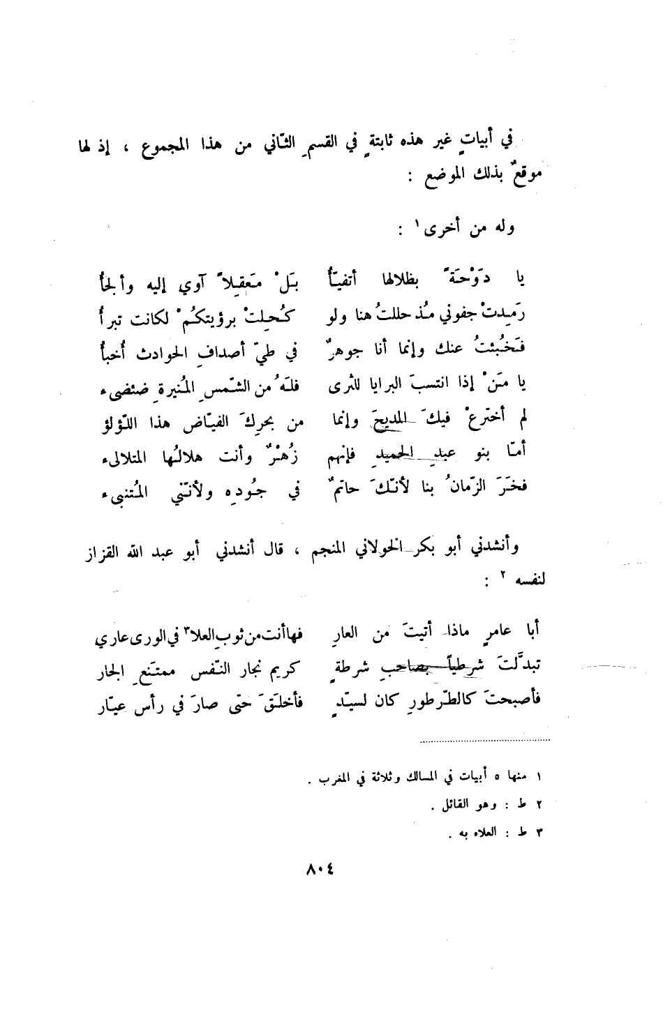 فخر الزمان بنا لأنك حاتم ... في جوده ولأنني المتنبئ وأنشدني أبو بكر الخولاني المنجم، قال أنشدني أبو عبد الله القزاز لنفسه: