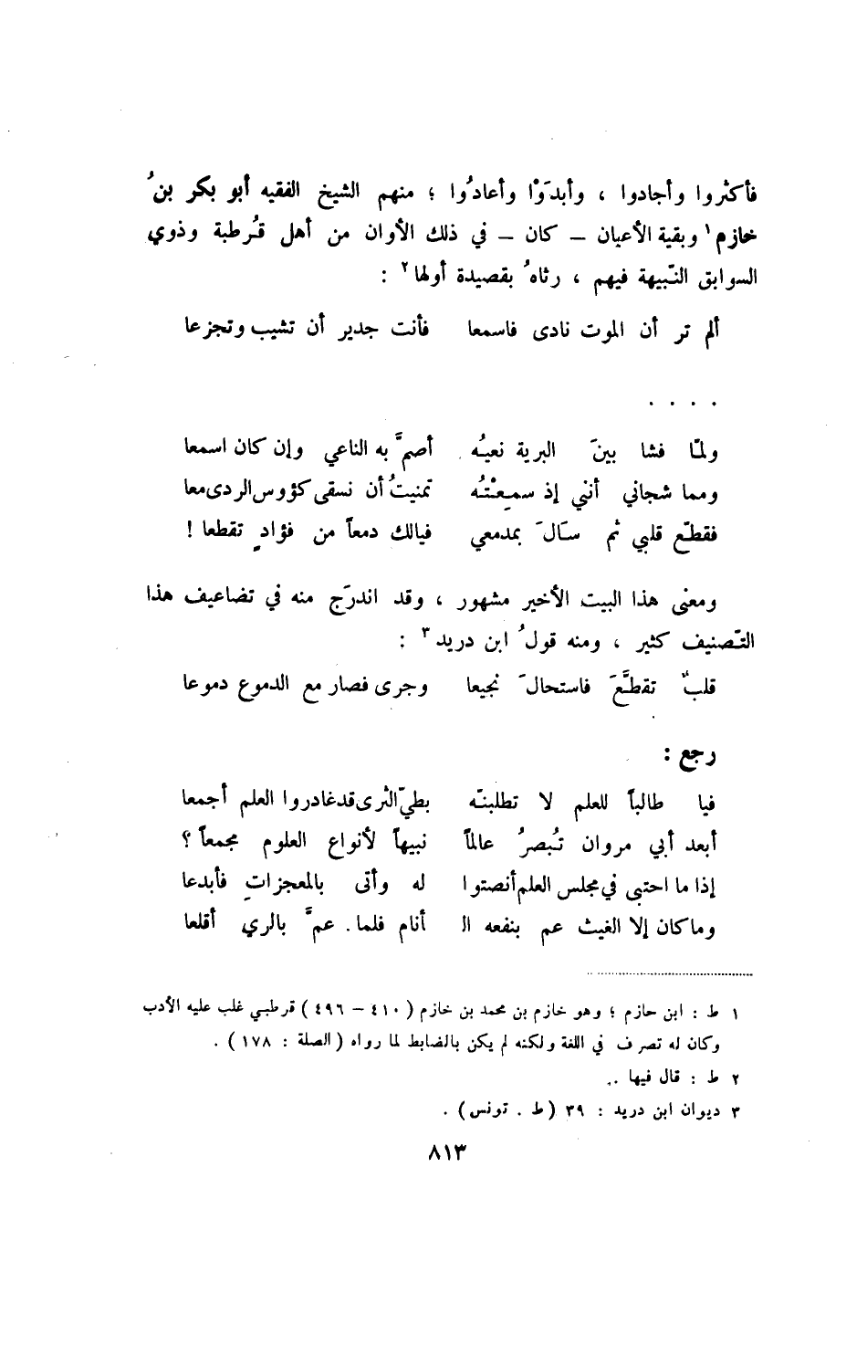 فأكثروا وأجادوا، وأبدوا وأعادوا؛ منهم الشيخ الفقيه أبو بكر بن خازم وبقية الأعيان - كان - في ذلك الأوان من أهل قرطبة وذوي السوابق النبيهة فيهم، رثاه بقصيدة أولها: