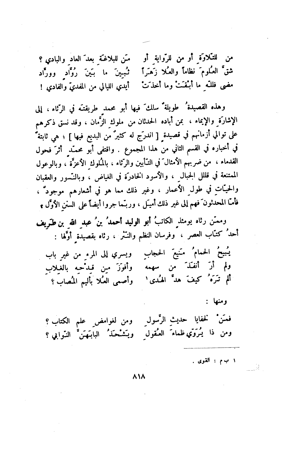 مضى ما أبقت وما أخذت ... أيدي الليالي من المفدي والفادي! وهذه القصيدة طويلة سلك فيها أبو محمد طريقته في الرثاء، إلى الإشارة والإيماء، بمن أباده الحدثان من ملوك الزمان، وقد نسق ذكرهم على توالي أزمانهم في قصيدة [اندرج له كثير من البديع فيها] ؛ هي ثابتة في أخباره في القسم الثاني من هذا المجموع. واقتفى أبو محمد أثر فحول القدماء، من ضربهم الأمثال في التأبين والرثاء، بالملوك الأعزة، وبالوعول الممتنعة في قلل الجبال، والأسود الخادرة في الغياض، وبالنسور والعقبان والحيات في طول الأعمار، وغير ذلك مما هو في أشعارهم موجود، فأما المحدثون فهم إلى غير ذلك أميل، وربما جروا أيضاً على السنن الأول.
