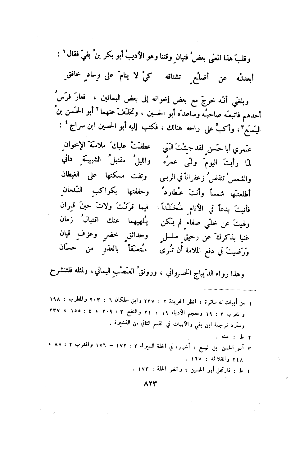 أبعدته عن أضلع تشاقه ... كي لا ينام على وساد خافق وبلغني أنه خرج مع بعض إخوانه إلى بعض البساتين، فعار فرس أحدهم فاتبعه صاحبه وساعده أبو الحسين، وتخلف عنهما أبو الحسن بن اليسع، وأكب على راحه هنالك، فكتب إليه أبو الحسين ابن سراج:
