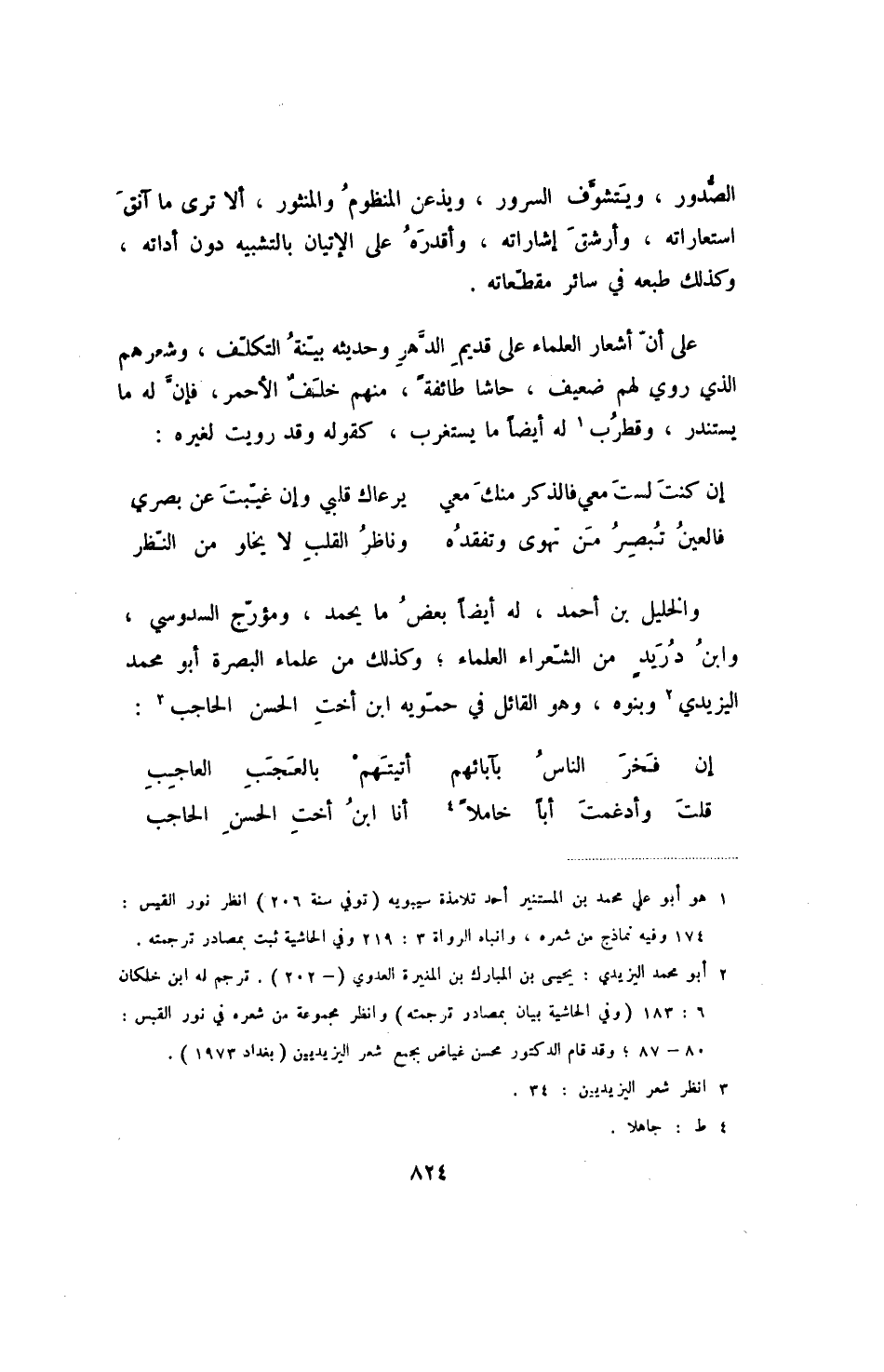 فالعين تبصر من تهوى وتفقده ... وناظر القلب لا يخلو من النظر والخليل بن احمد، له أيضاً بعض ما يحمد، ومؤرج السدوسي، وابن دريد من الشعراء العلماء؛ وكذلك من علماء البصرة أبو محمد اليزيدي وبنوه، وهو القائل في حمويه ابن أخت الحسن الحاجب: