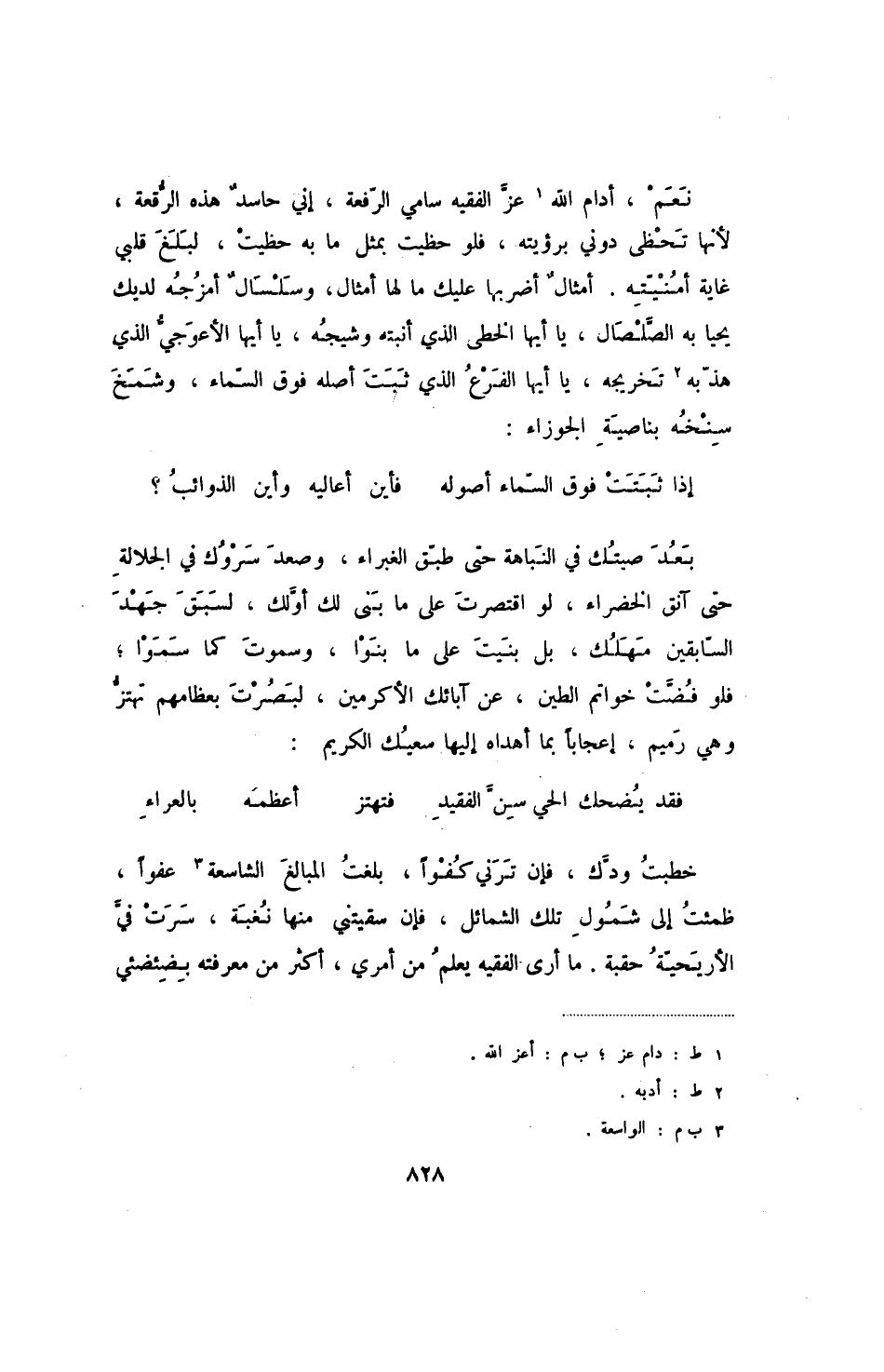 نعم، أدام الله عز الفقيه سامي الرفعة، إني حاسد هذه الرقعة، لأنها تحظى دوني برؤيته، فلو حظيت بمثل ما به حظيت، لبلغ قلبي غاية أمنيته. أمثال أضربها عليك ما لها أمثال، وسلسال أمزجه لديك يحيا به الصلصال، يا أيها الخطى الذي أنبته وشيجه، يا أيها الأعوجي الذي هذبه تخريجه، يا أيها الفرع الذي ثبت أصله فوق السماء، وشمخ سنخه بناصية الجوزاء: