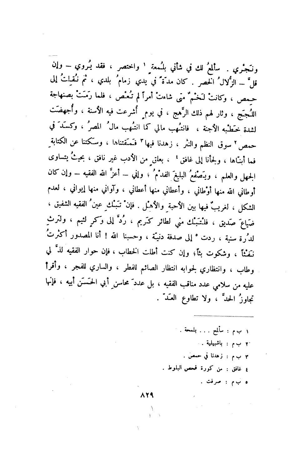 ونجري. سألمع لك في شأني بلمعة واختصر، فقد يروي - وإن قل - الزلال الخصر. كان مدة في يدي زمام بلدي، ثم نقلت إلى حمص، وكانت لخم متى شاءت أمراً لم تعص، فلما رمت بصنهاجة اللجج، وثار لهم ذلك الرهج، في يوم أشرعت فيه الأسنة، وأجهضت لشدة خطبه الأجنة، فانتهب مالي كما انتهب مال المصر، وكسد في حمص سوق النظم والنثر، زهدنا فيها فمقتناها، وسكتنا عن الكتابة فما أبناها، ولجأنا إلى غافق، بعلق من الأدب غير نافق، بحيث يتساوى الجهل والعلم، ويصفع البليغ الفدم؛ وإني - أعز الله الفقيه - وإن كان أوطاني الله منها أوطاني، وأعطاني منها أعطاني، وآواني منها إيواني، لعدم الشكل، لغريب فيها بين الأحبة والأهل. فإن تبك عين الفقيه الشفيق، ضياع صديق، فلتبك مني لطائر كريم، رد إلى وكر لئيم، ولترث لدرة سنية، ردت إلى صدفة دنية، وحسبنا الله! أنا المصدور أكثرت نفثاً، وشكوت بثاً؛ وإن كنت أطلت الخطاب، فان حوار الفقيه لذ لي وطاب، وانتظاري لجوابه انتظار الصائم للفطر، والساري للفجر، وأقرأ عليه من سلامي عدد مناقب الفقيه، بل عدد محاسن أبي الحسن أبيه، فإنها تجاوز الحد، ولا تطاوع العد.