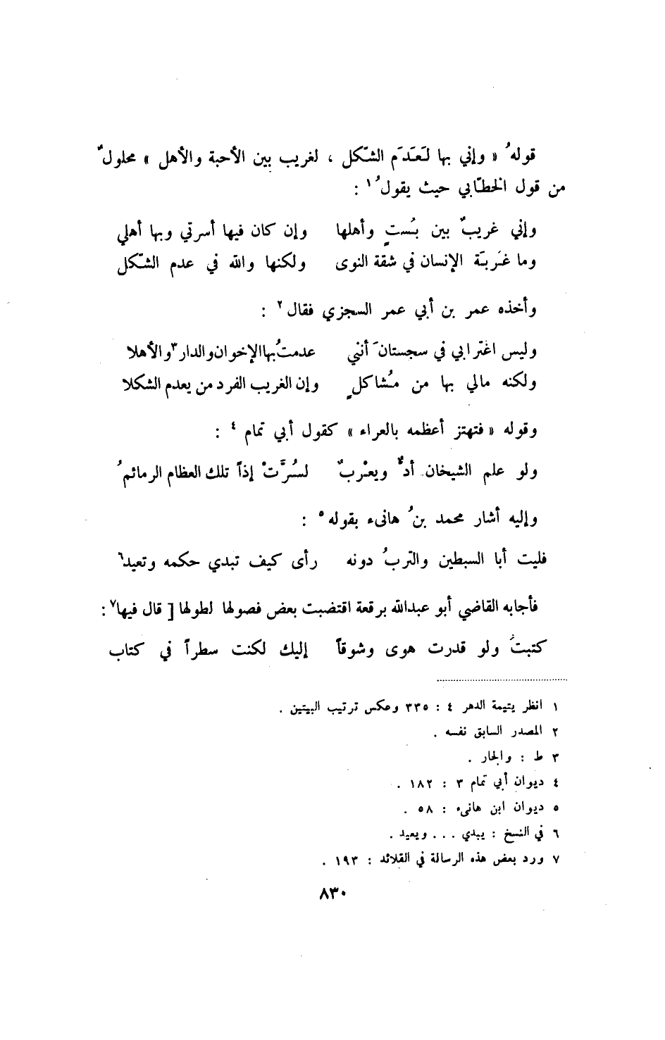 قوله " وإني بها لعدم الشكل، لغريب بين الأحبة والأهل " محلول من قول الخطابي حيث يقول: