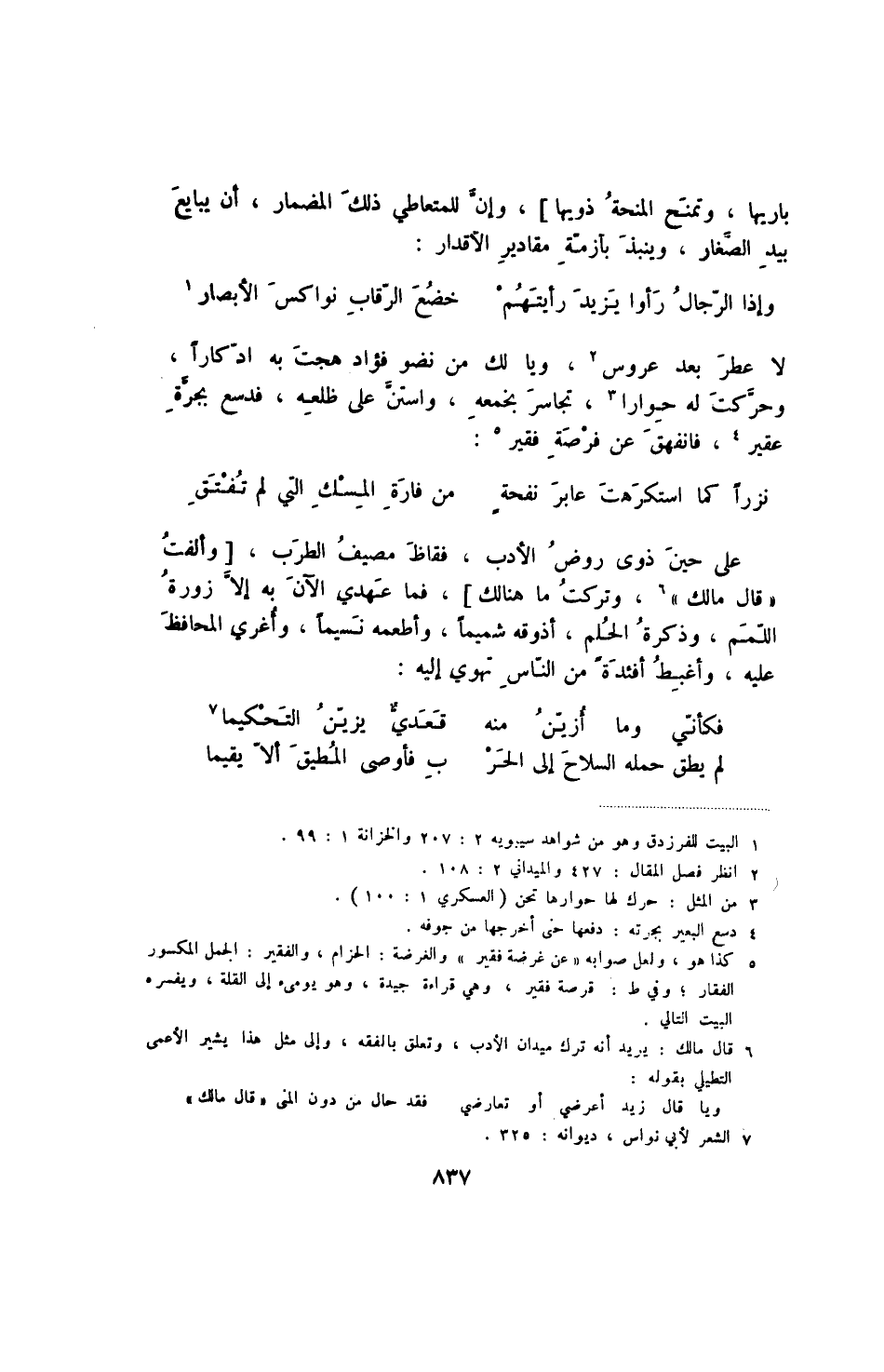 نزرا كما استكرهت عابر نفحة ... من فارة المسك التي لم تفتق على حين ذوى روض الأدب، فقاظ مصيف الطرب، [وألفت " قال مالك "، وتركت ما هنالك] ، فما عهدي الآن إلا زورة اللمم، وذكرة الحلم، أذوقه شميما، وأطعمه نسيما، وأغري المحافظ عليه، وأغبط أفئدة من الناس تهوي إليه: