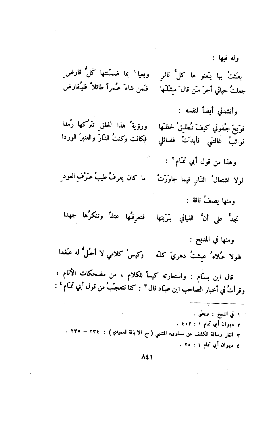 فلولا علاه عشت دهري كله ... وكيس كلامي لا أحل له عقدا قال ابن بسام: واستعارته كيساً للكلام، من مضحكات الأنام، وقرأت في أخبار الصاحب ابن عباد قال: كنا نتعجب من قول أبي تمام: