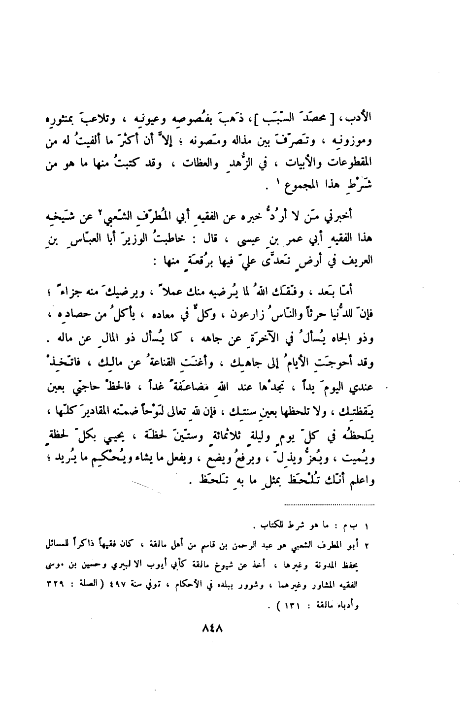 أما بعد، وفقك الله لما يرضيه منك عملاً، ويرضيك منه جزاءً؛ فإن للدنيا حرثاً والناس زارعون، وكل في معاده، يأكل من حصاده، وذو الجاه يسأل في الآخرة عن جاهه، كما يسأل ذو المال عن ماله. وقد أحوجت الأيام إلى جاهك، وأغنت القناعة عن مالك، فاتخذ عندي اليوم يداً، تجدها عند الله مضاعفة غداً، فالحظ حاجتي بعين يقظتك، ولا تلحظها بعين سنتك، فان لله لوحاً ضمنه المقادير كلها، يلحظه في كل يوم وليلة ثلاثمائة وستين لحظة، يحي بكل لحظة ويميت، ويعز ويذل، ويرفع ويضع، ويفعل ما يشاء ويحكم ما يريد؛ واعلم أنك تلحظ بمثل ما به تلحظ.