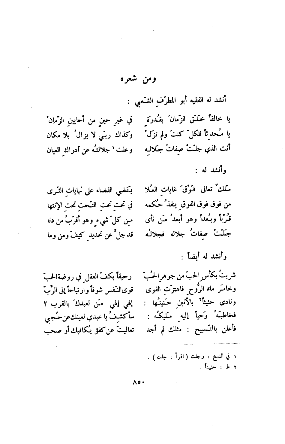 جلت صفات جلاله فجلاله ... قد جل عن تحديد كيف ومن وما وأنشد له أيضاً:
