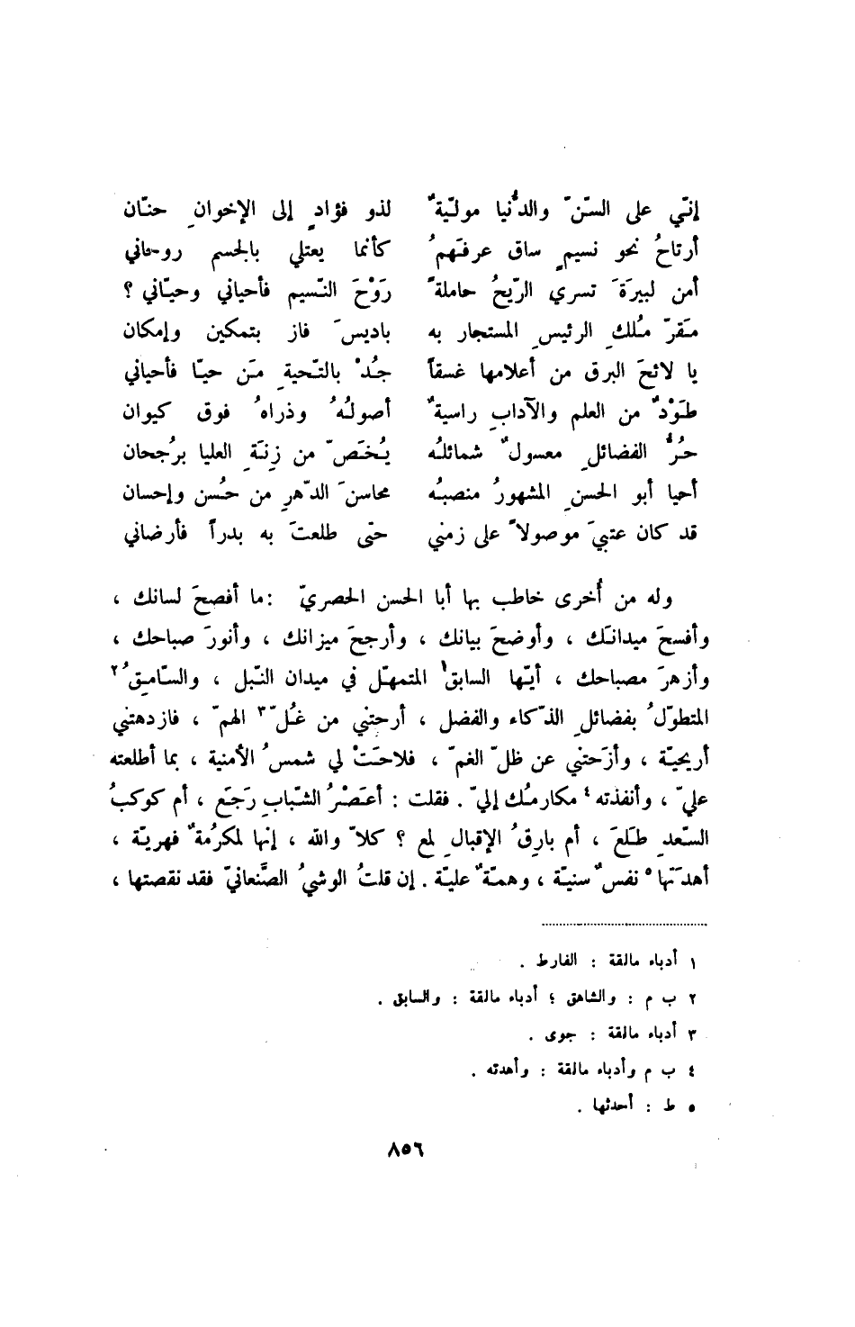 قد كان عتبي موصلاً على زمني ... حتى طلعت به بدراً فأرضاني وله من أخرى خاطب بها أبا الحسن الحصري: ما أفصح لسانك، وأفسح ميدانك، وأوضح بيانك، وأرجح ميزانك، وأنور صباحك، وأزهر مصباحك، أيها السابق المتمهل في ميدان النبل، والسامق المتطول بفضائل الذكاء والفضل، أرحتني من غل الهم، فازدهتني أريحية، وأزحتني عن ظل الغن، فلاحت لي شمس الأمنية، بما أطلعته علي، وأنفذته مكارمك إلي. فقلت: أعصر الشباب رجع، أم كوكب السعد طلع، أم بارق الإقبال لمع - كلا والله، إنها لمكرمة فهرية، أهدتها نفس سنية، وهمة علية. إن قلت الوشي الصنعاني فقد نقصتها