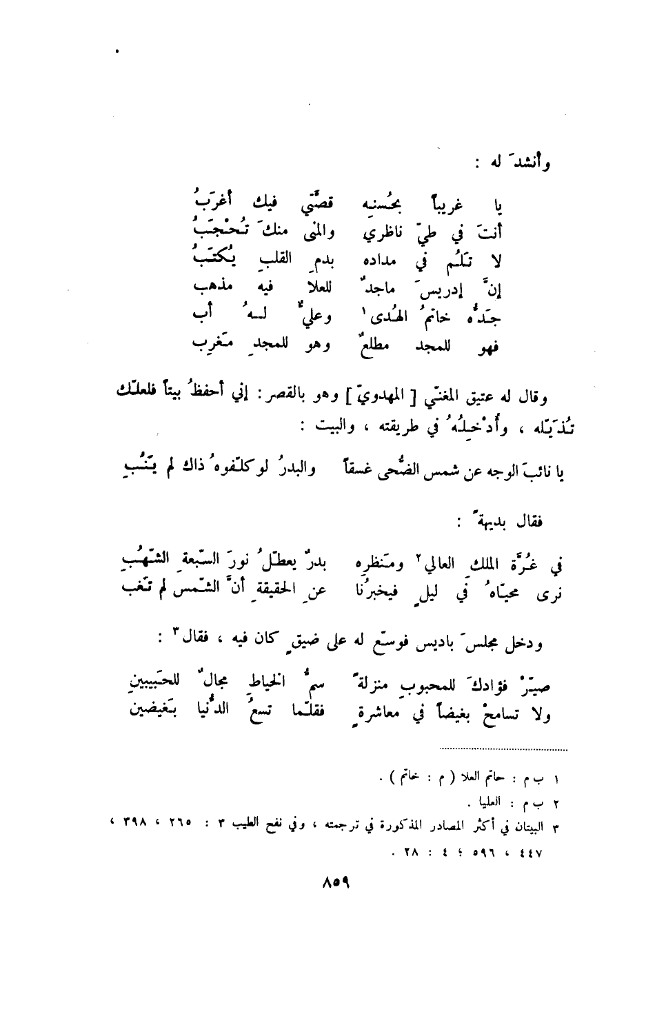 نرى محياه في ليل فيخبرنا ... عن الحقيقة أن الشمس لم تغب ودخل مجلس باديس فوسع له على ضيق كان فيه، فقال: