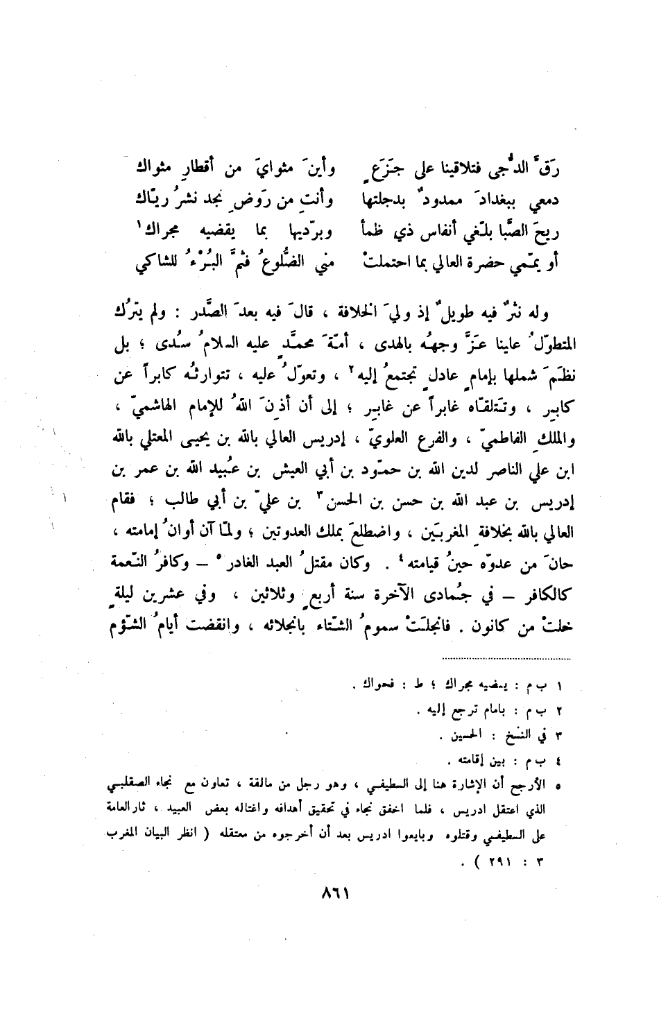 أو يممي حضرة العالي بما احتملت ... مني الضلوع فثم البرء للشاكي وله نثر فيه طويل إذ ولي الخلافة، قال فيه بعد الصدر: ولم يترك المتطول علينا عز وجهه بالهدى أمة محمد عليه السلام سدى؛ بل نضم شملها بإمام عادل تجتمع إليه، وتعول عليه، تتوارثه كابرا عن كابر، وتتلقاه غابرا عن غابر؛ إلى أن أذن الله للإمام الهاشمي، والملك الفاطمي، والفرع العلوي، إدريس العالي بالله بن يحيى المعتلي بالله ابن علي الناصر لدين الله بن حمود بن أبي العيش بن عبيد الله بن عمر بن إدريس بن عبد الله بن حسن بن الحسن بن علي بن أبي طالب؛ فقام العالي بالله بخلافة المغربين، واضطلع بملك العدوتين؛ ولما آن أوان إمامته، حان من عدوه حين قيامته. وكان مقتل العبد الغادر - وكافر النعمة كالكافر - في جمادى الآخرة سنة أربع وثلاثين، وفي عشرين ليلة خلت من كانون. فانجلت سموم الشتاء بانجلائه، وانقضت أيام الشؤم